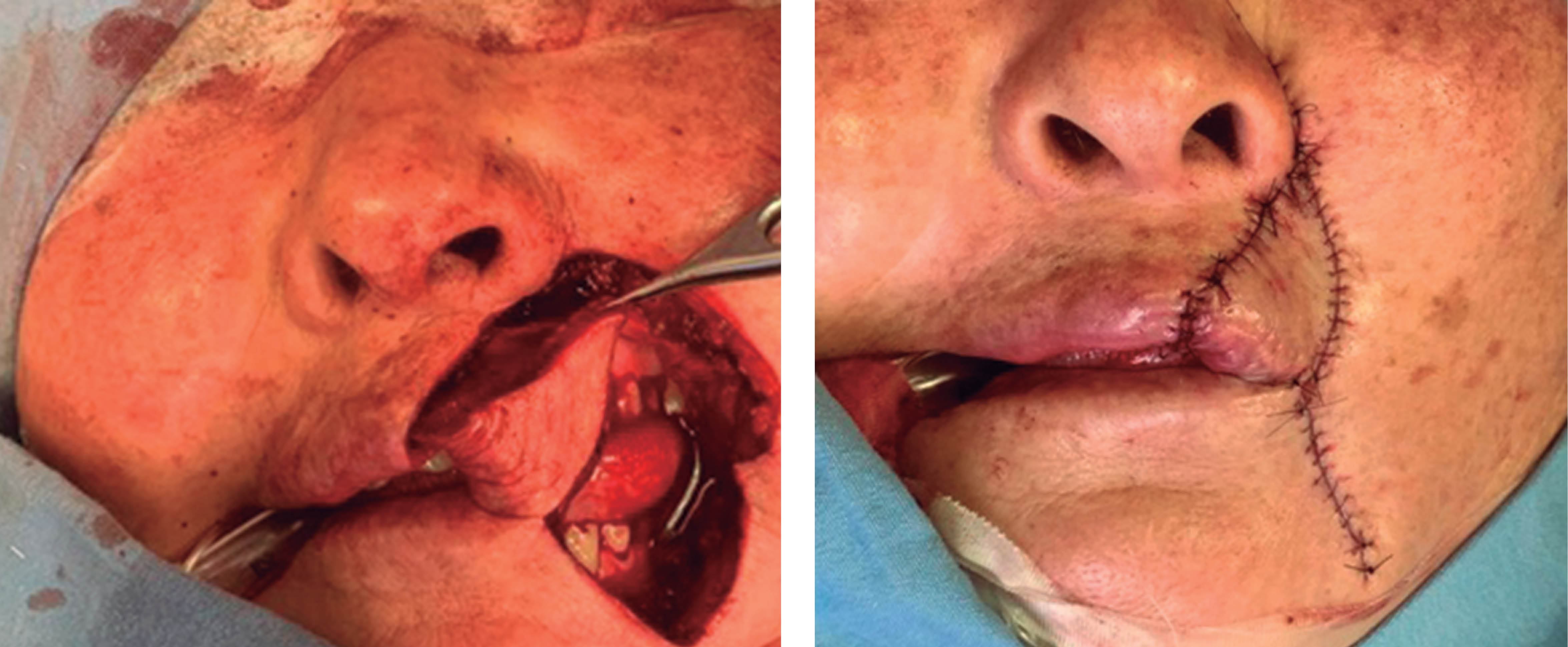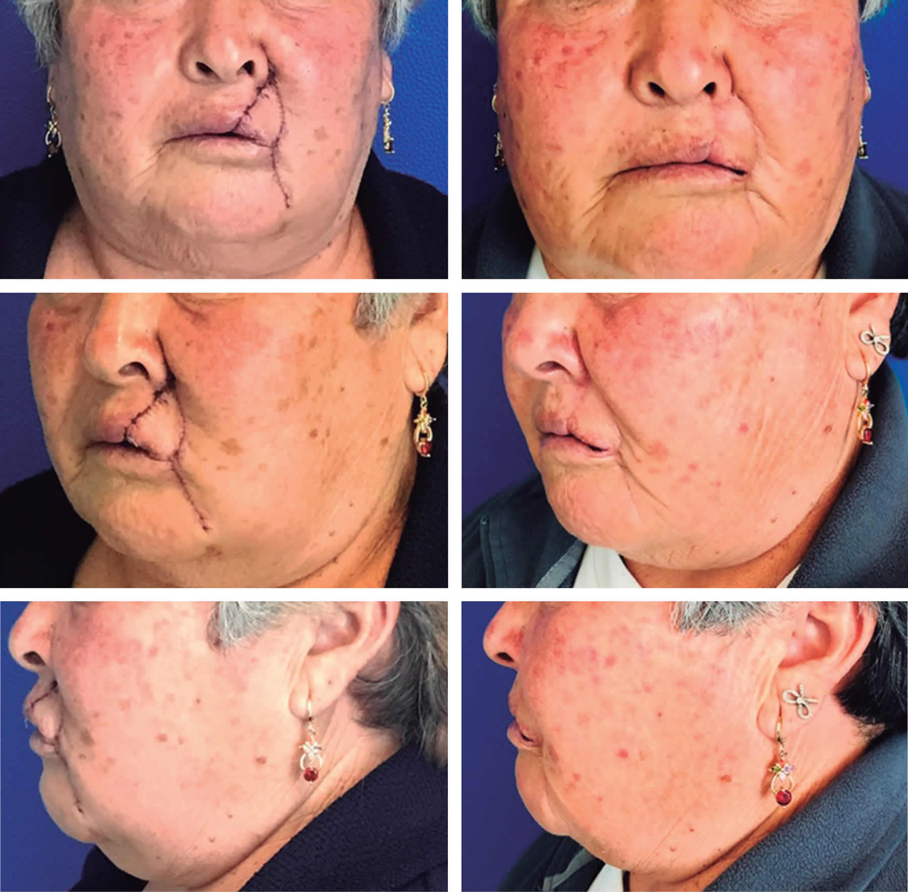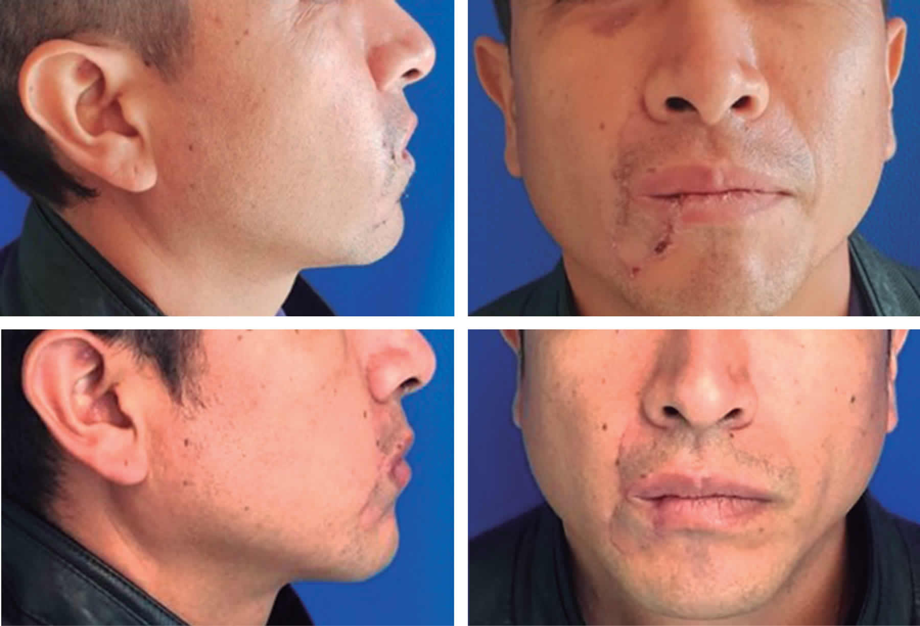 Los resultados finales en nuestros pacientes cumplen la mayoría de los principios de reconstrucción, habiendo logrado una completa cubierta cutánea y revestimiento oral, adecuada apariencia del bermellón, diámetro estomal adecuado, sensación preservada y esfínter oral competente, por lo que no se requirió un segundo procedimiento.