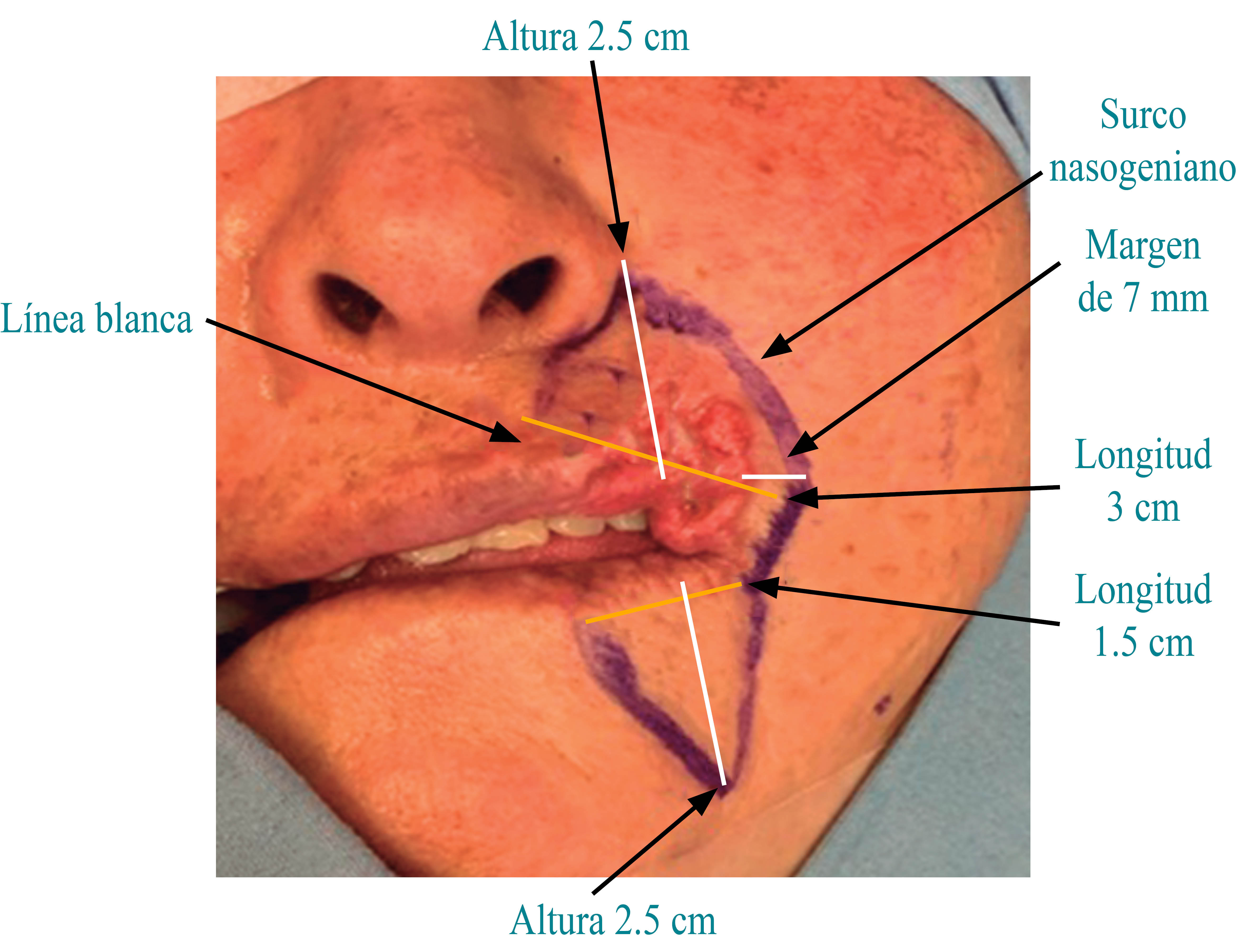 La técnica propuesta Yamauchi M comenta que la incisión se debe realizar en el espesor total hasta llegar al borde del bermellón, respetando éste para preservar la irrigación de la arteria labial superior. Es importante que al momento de realizar el giro del colgajo se pueda observar la posición del pedículo. Se debe prestar atención al momento de realizar el cierre, ya que el músculo cigomático mayor y menor así como el risorio y bucinador se deben suturar al músculo orbicular para generar una adecuada tensión.7,17