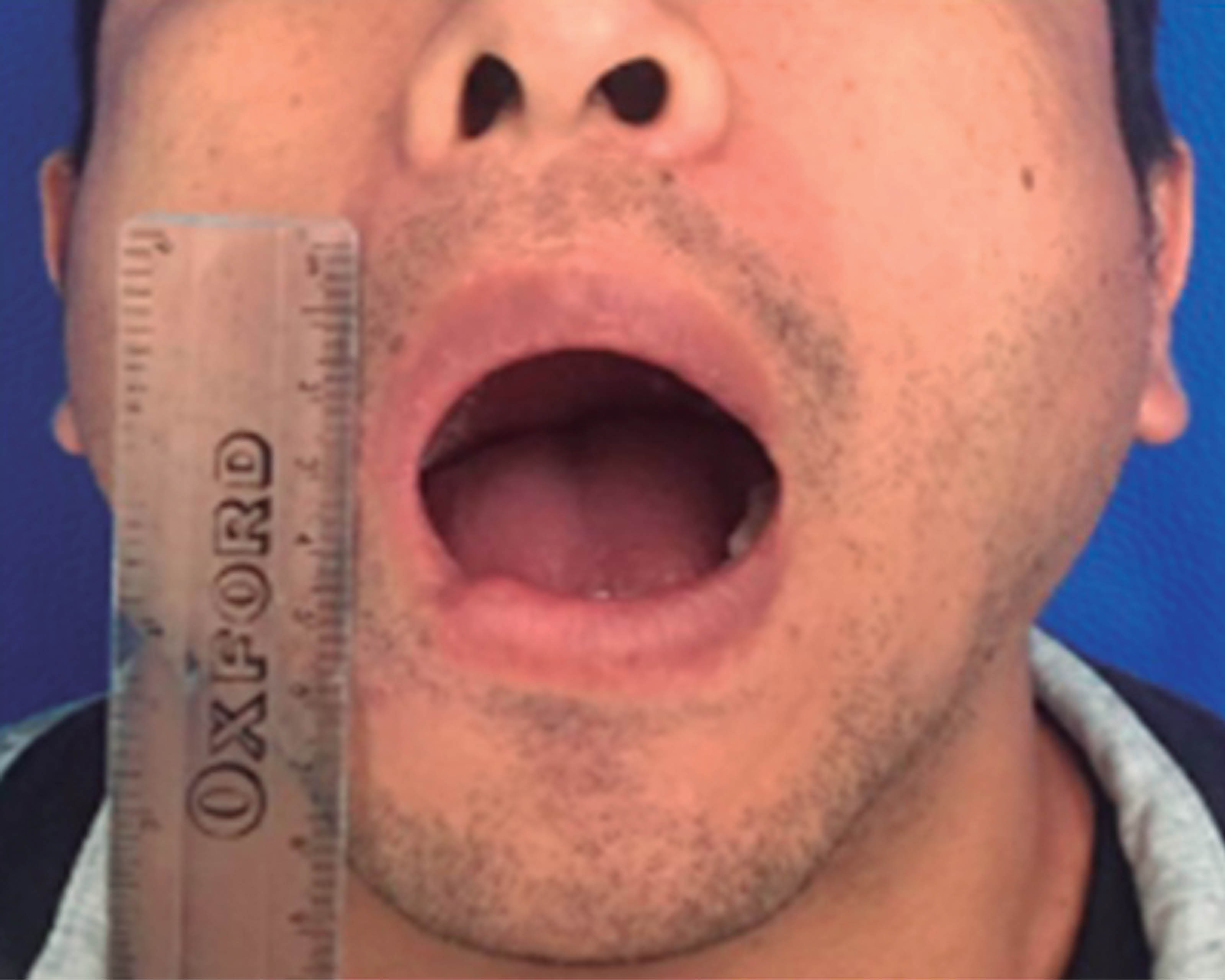 La desventaja principal es que el colgajo involucra la comisura labial con un aspecto romo, que en algunos casos no es muy notorio con la boca cerrada, pero se hace obvio al abrir la boca (Figura 9). En nuestros casos observamos una ligera asimetría, pero creemos que el resultado final fue positivo teniendo en cuenta que la lesión afectaba más de dos tercios del labio inferior y superior, que a menudo requieren comisuroplastias.