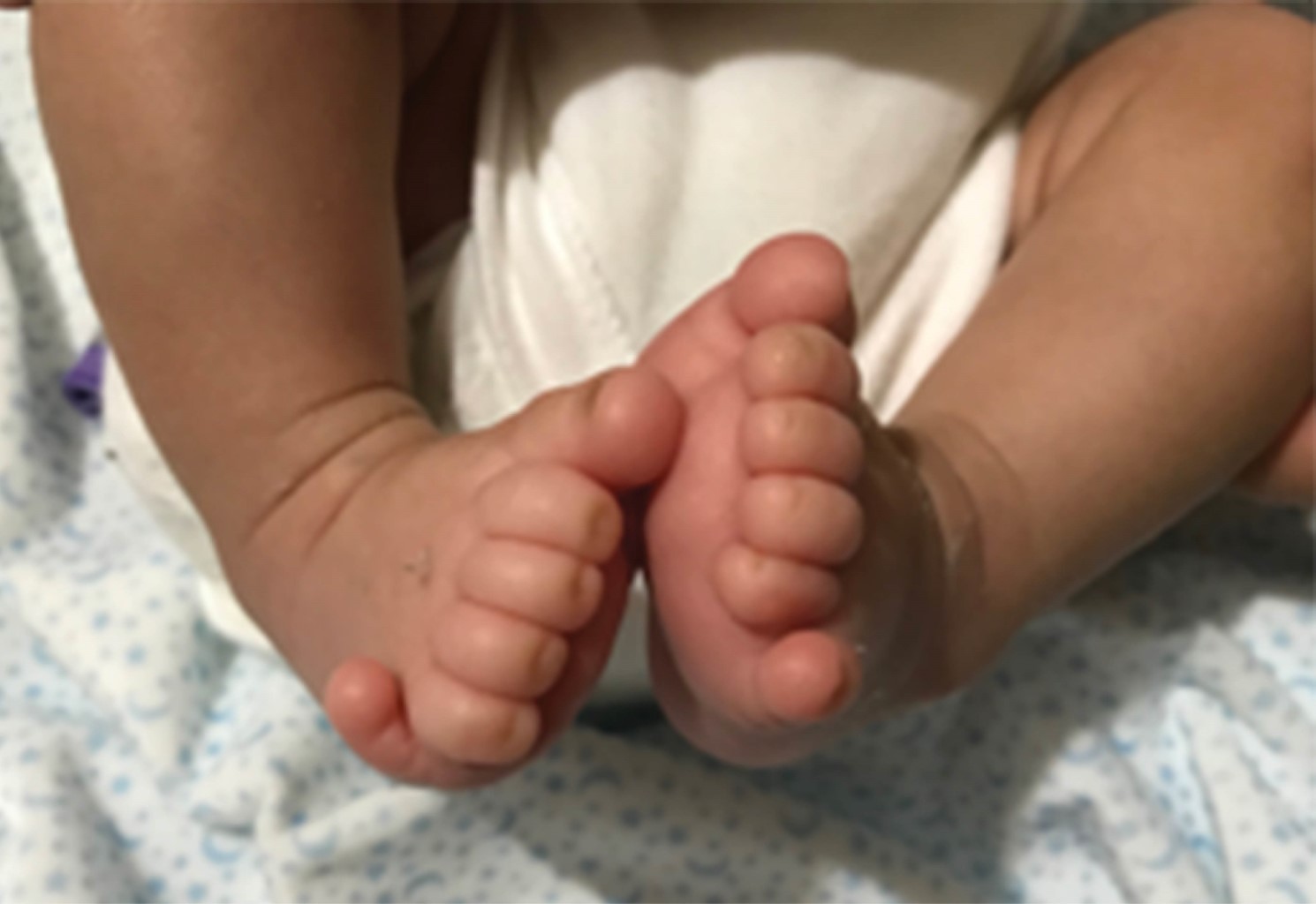 Presentamos el caso de un varón RN, pretérmino de 34 semanas de gestación. Fue el primogénito de padres jóvenes sanos, no consanguíneos. La madre había presentado cuatro abortos espontáneos previos. El embarazo cursó sin complicaciones; sin embargo, requirió cesárea urgente porque se detectó por ultrasonido retraso en el crecimiento intrauterino tipo II. Al nacimiento presentó distrés respiratorio que requirió soporte con ventilación. A la exploración física destacaba facies dismórfica (Figura 1), hipertelorismo, raíz nasal ancha, pabellones auriculares de implantación límite, labio superior fino, anquiloglosia, cuello corto con pliegue nucal redundante, hipotonía axial, criptorquidia bilateral y polidactilia en ambos pies (Figura 2). En fondo de ojo, papilas con gran excavación y zona central con coloboma en ojo derecho.
