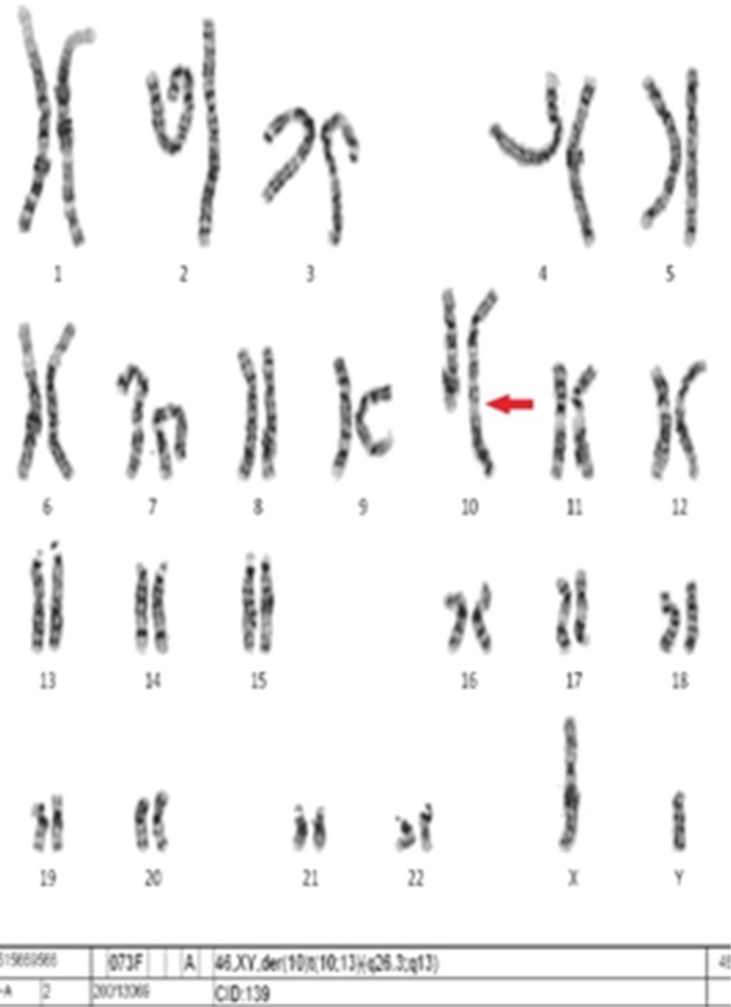 Ante los hallazgos clínicos, se realizó cariotipo en sangre periférica mediante técnica de bandas GTG. Tras el estudio de 20 metafases, con una resolución cromosómica de 500 bandas, se obtuvo la fórmula cromosómica 46,XY,der(10)t(10;13)(q26.3;q13). En el estudio citogenético se detectó la presencia de un cromosoma 10 derivativo, originado por una translocación recíproca entre los cromosomas 10 y 13 (Figura 3), producida por una reorganización desequilibrada, lo que produce una trisomía casi completa del cromosoma 13 y una monosomía 10q terminal.