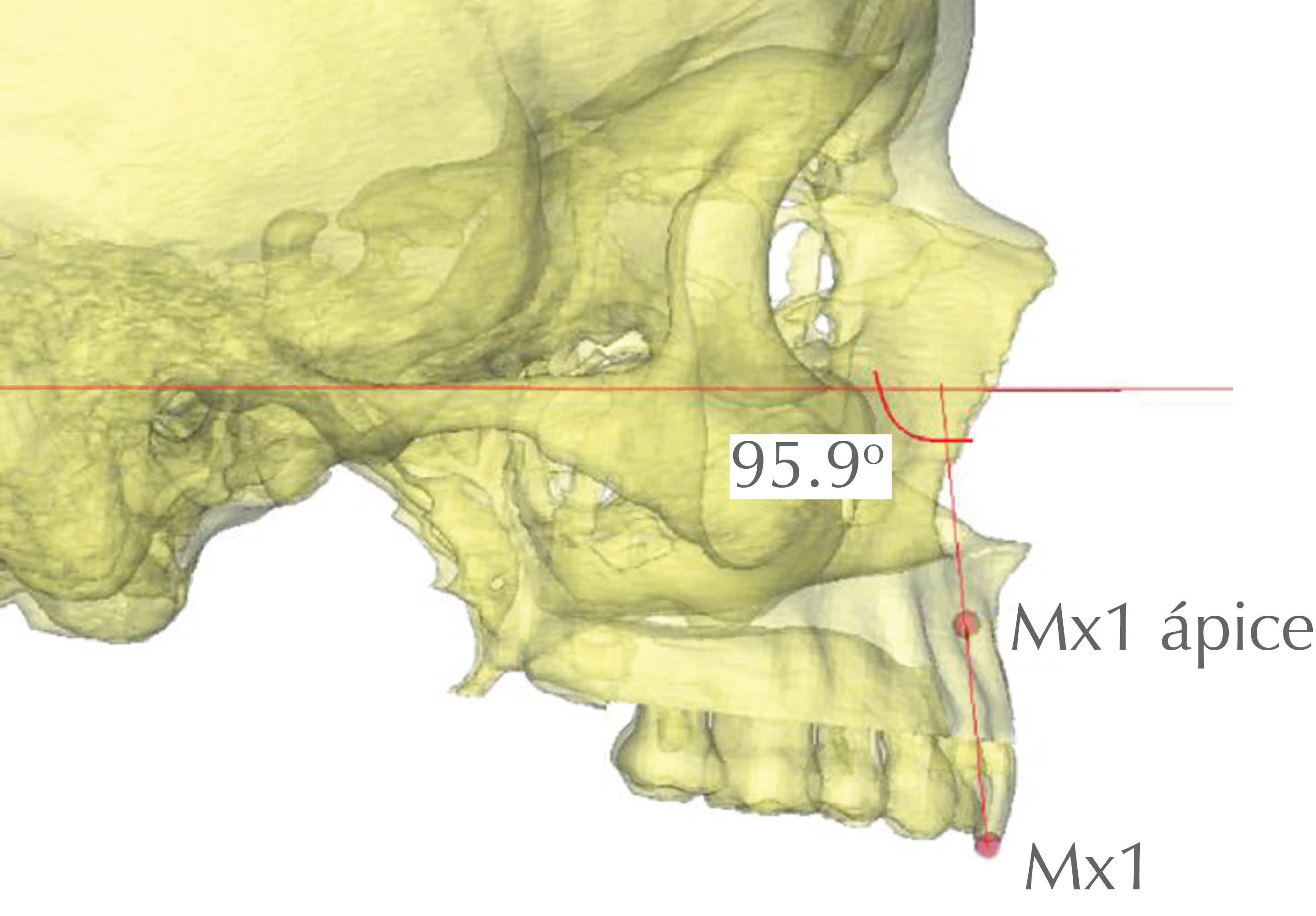 - 4. Mx-FH: posición media maxilar superoinferior; distancia entre el punto maxilar (Mx: punto equidistante entre la espina nasal anterior y la espina nasal posterior) y el plano horizontal de Frankfurt (Figura 11).