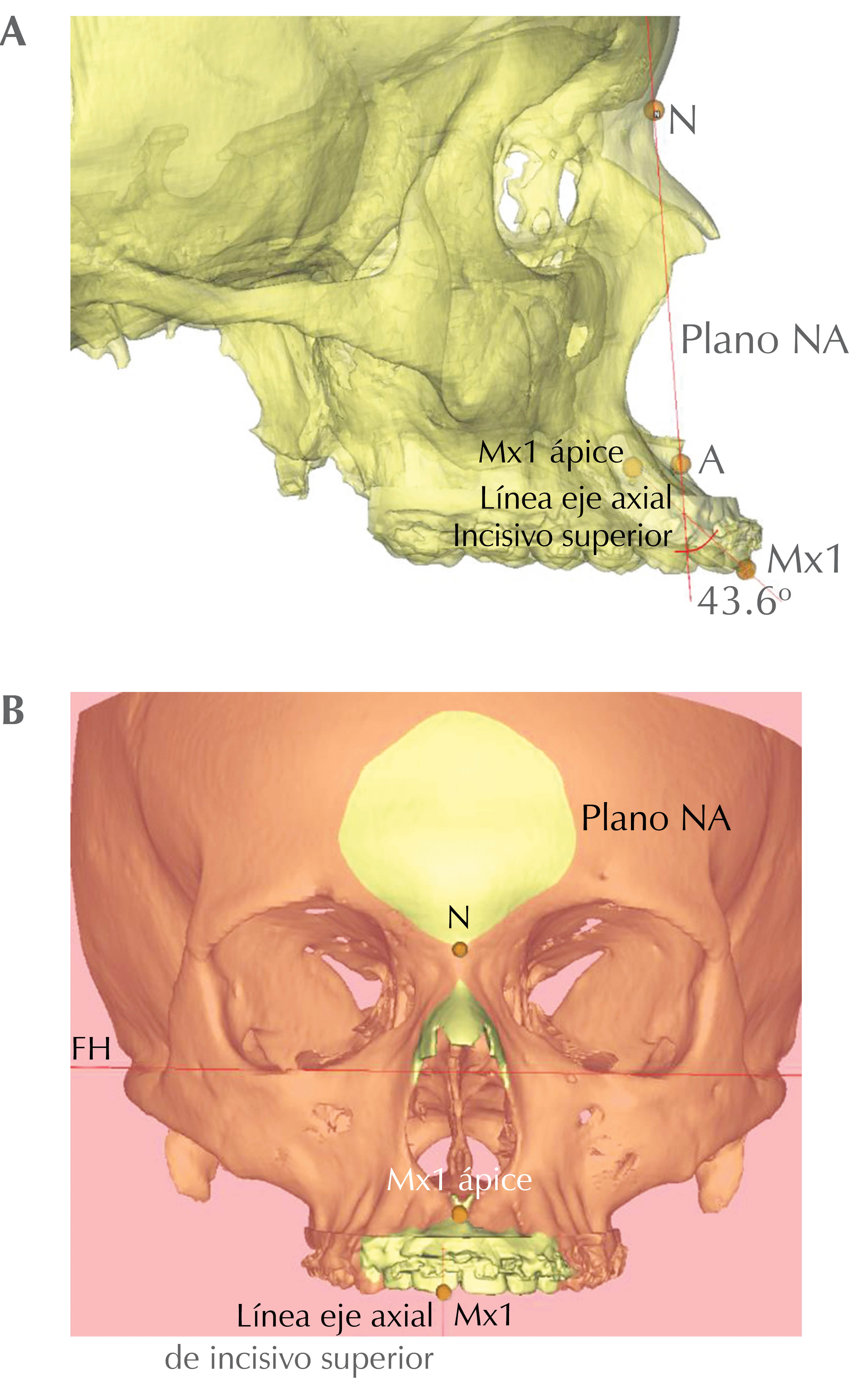 - 8. 1-NA: angulación clínica del incisivo superior; medición del ángulo formado por el eje axial del incisivo superior y la línea NA (nasión-punto A) (Figura 15A y B ).