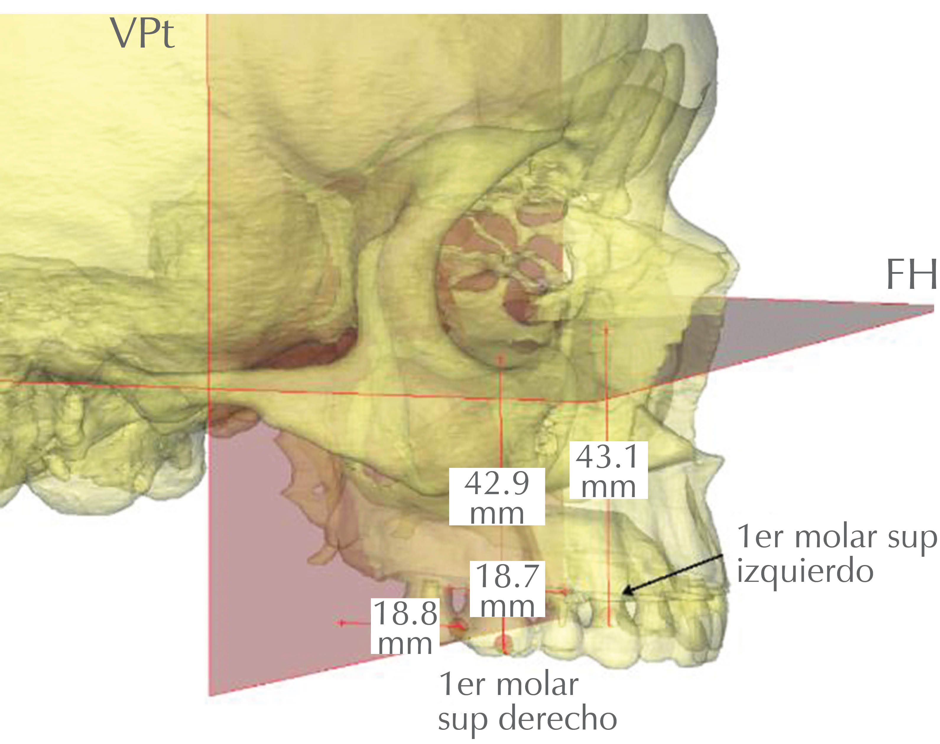 - 34. PMS-VPt: proyección anteroposterior de la prominencia malar superior (PMS); distancia de la PMS a la vertical pterigoidea (VPt) (Figura 39).