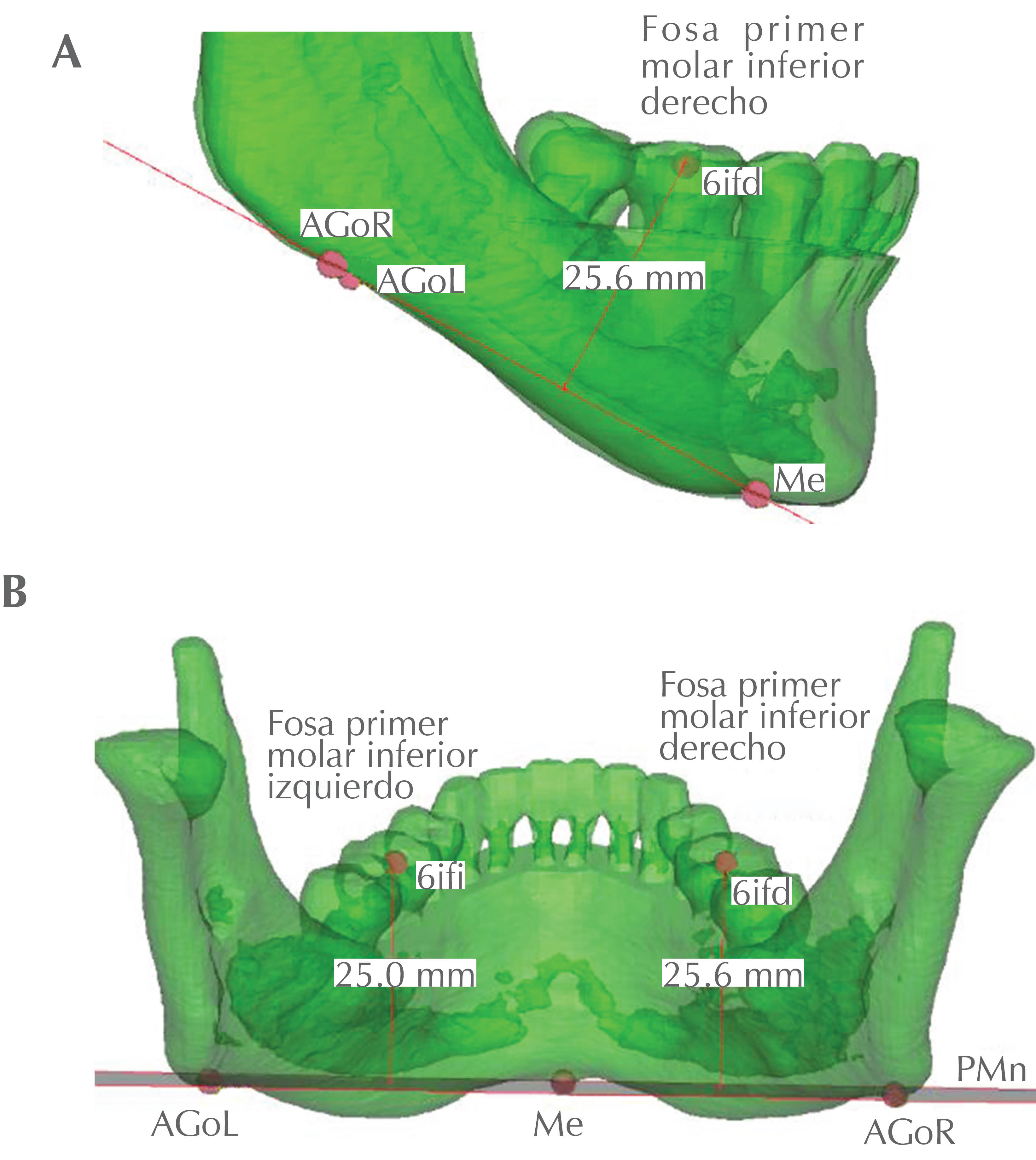 - 18. 6f-PMn: altura dentoalveolar posterior inferior; distancia entre el punto más inferior de la fisura mesial del primer molar inferior al plano mandibular (medida perpendicular) (Figura 24A y B ).