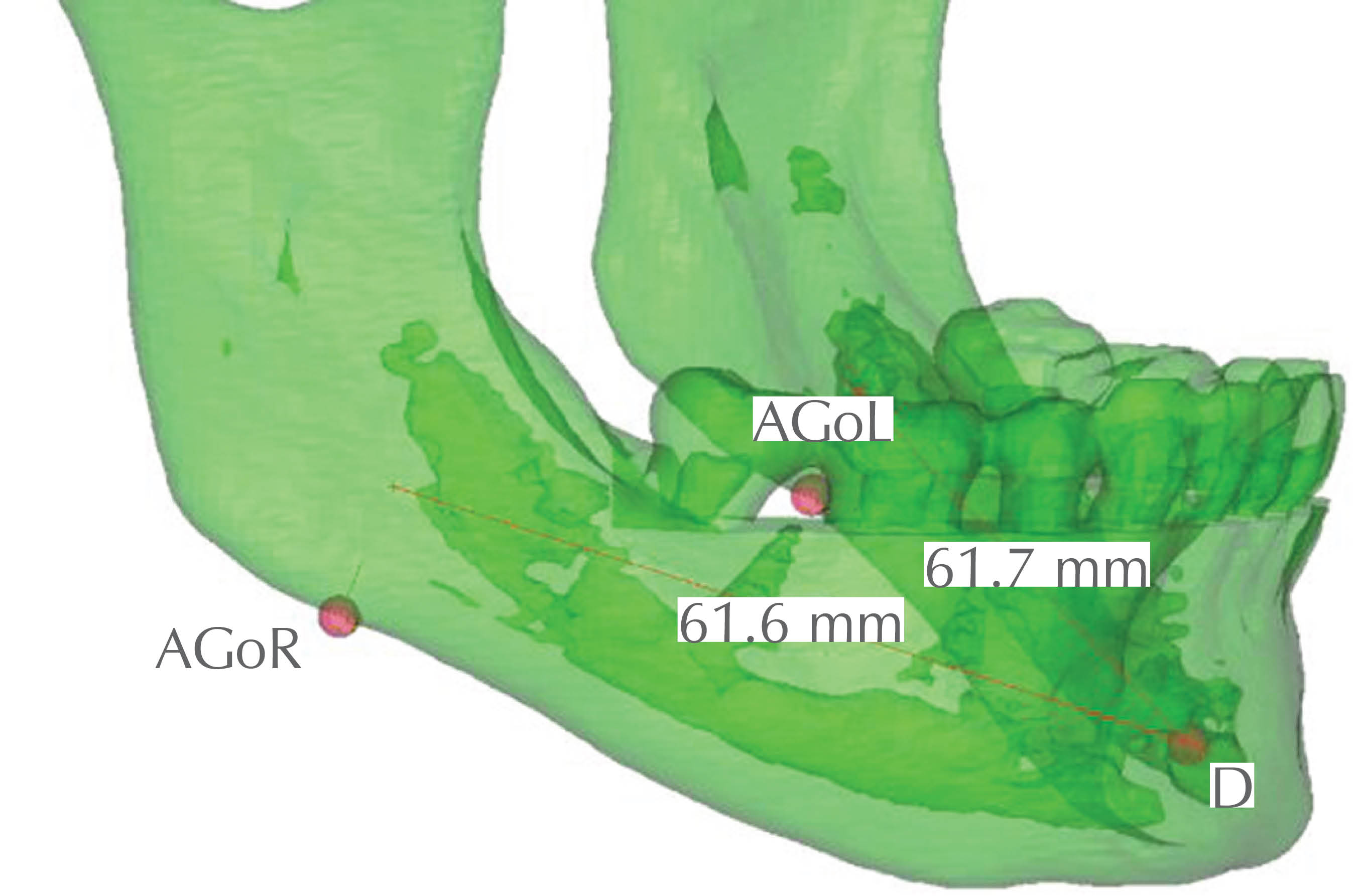 Distancia entre los puntos antegoniales derecho e izquierdo (AGoR) (AGoL) y el punto D (centro geométrico de la sínfisis.