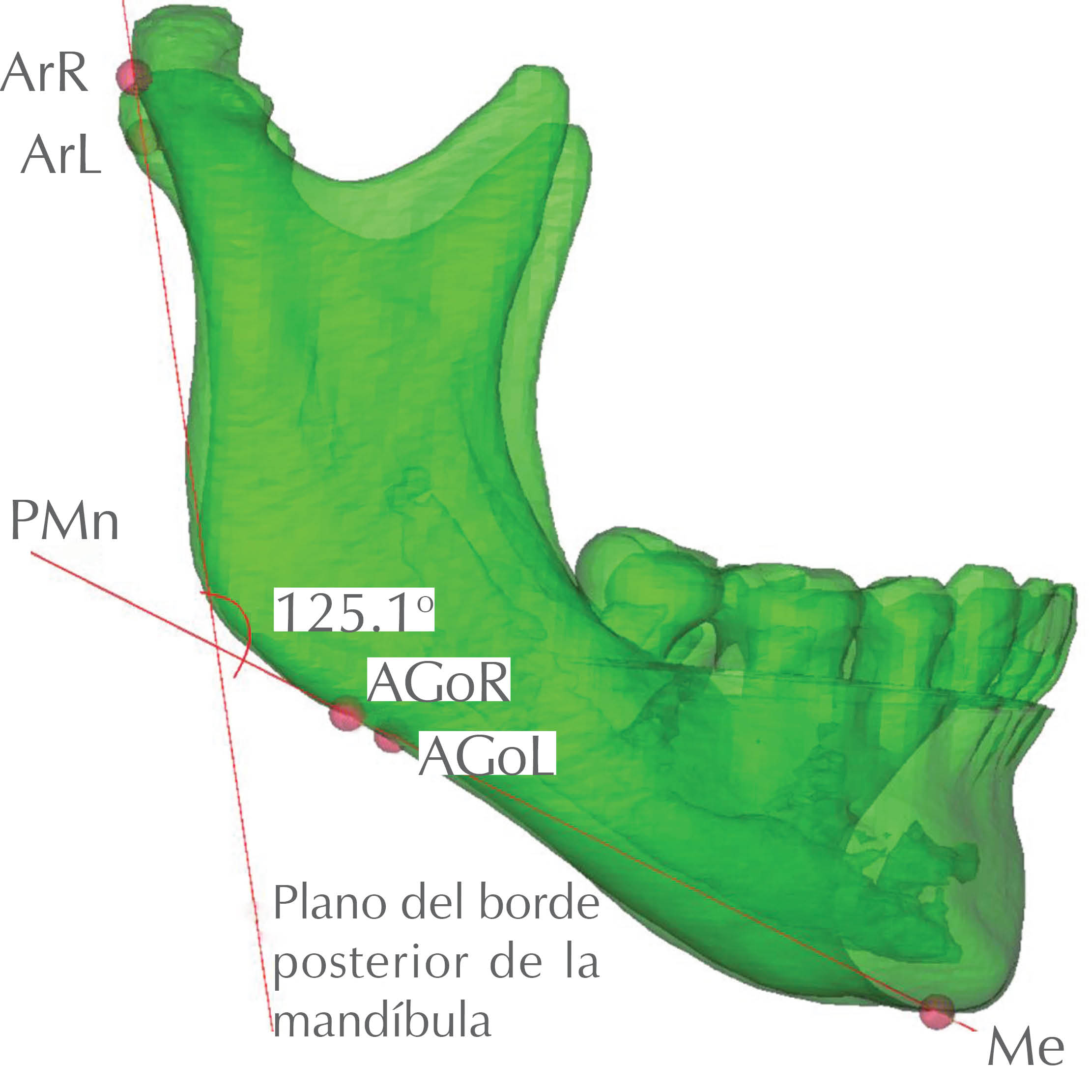 - 23. < Go: ángulo goniaco; ángulo formado por la intersección del plano mandibular (Me-AGoR-AGoL) y el plano posterior de la rama ascendente (ArR-ArL-GoR-GoL) (Figura 29).