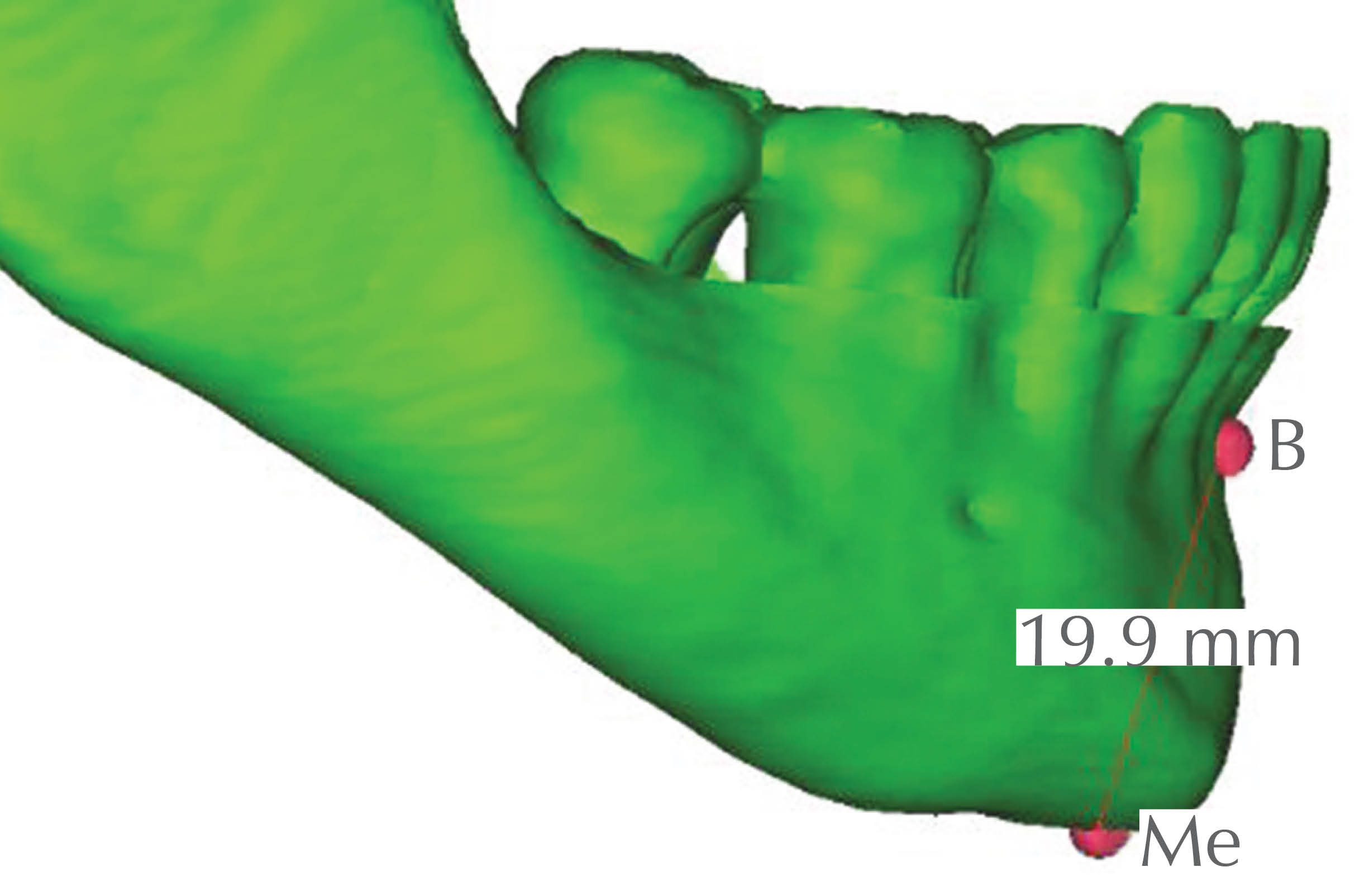 - 28. B-Me: altura del mentón; distancia entre el punto B (punto de mayor concavidad en la cara anterior del proceso dentoalveolar inferior) y el punto mentale (punto más inferior del reborde de la sínfisis) (Figura 33).