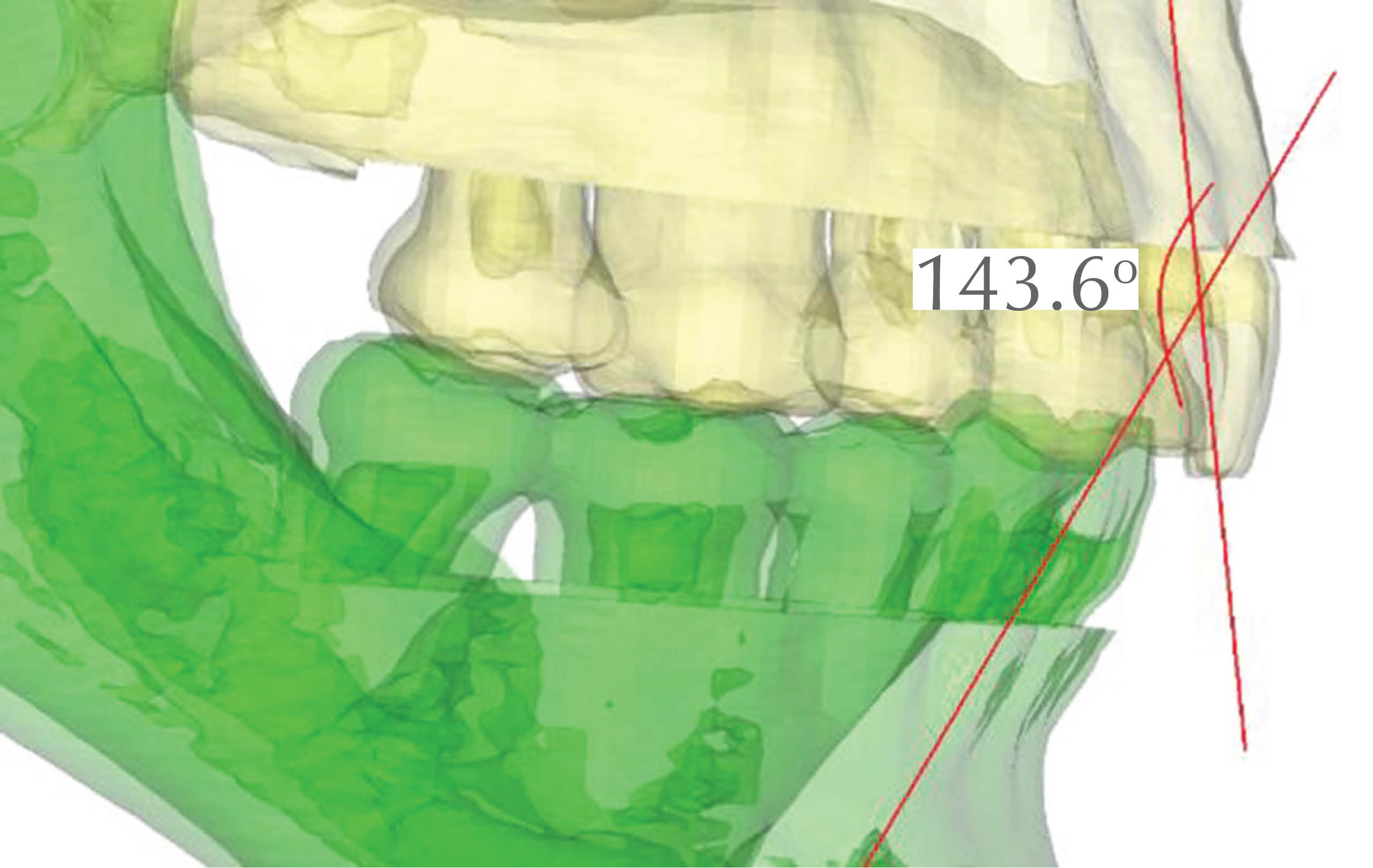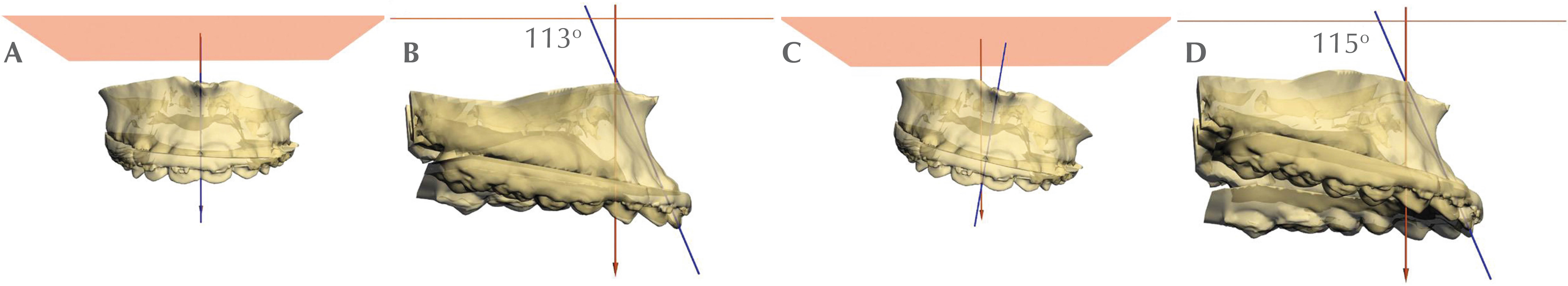 En la Figura 8, tomada del artículo de Gaateno,14,15 se calcula el ángulo entre el eje largo del incisivo y el plano de Frankfurt, en este ejercicio el incisivo central está orientado con un eje x (pich: cabeceo) de 113o, el eje y (roll: alabeo) de 0o, y el eje z (yaw: guiñada) de 0o. Como era esperado, el ángulo 3D entre el incisivo y el FH fue de 113o (Figura 8 A y B ). Posteriormente se giró el incisivo central superior alrededor de un eje anteroposterior o eje y (roll) 10o, el eje x (pich) se mantuvo en 113o y el eje z (yaw) se mantuvo en 0o. Esta transformación cambió la medición 3D del ángulo entre el incisivo superior y el plano de Frankfurt a 115o, 2o grados más abierto que la medición anterior (Figura 8C y D ). Según los autores este experimento se observa las diferencias entre las mediciones 2D convencionales y las mediciones 3D. En las mediciones 2D siempre interpretamos el ángulo entre el incisivo y FH como el "pich" (cabeceo) del incisivo en relación con la horizontal de Frankfurt. Y en las mediciones 3D este ángulo es una combinación de los ejes x, y, z "pich, roll, yaw".15