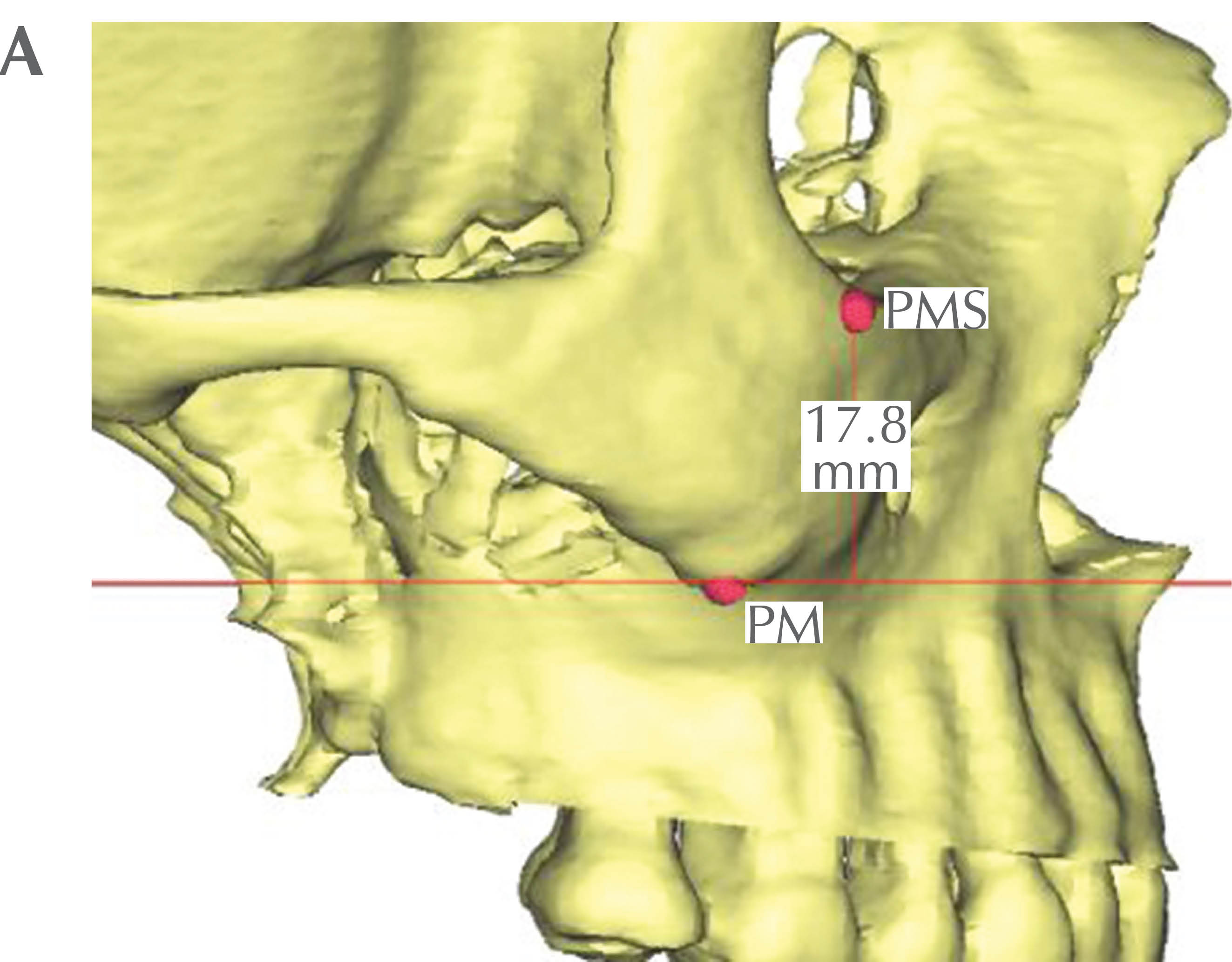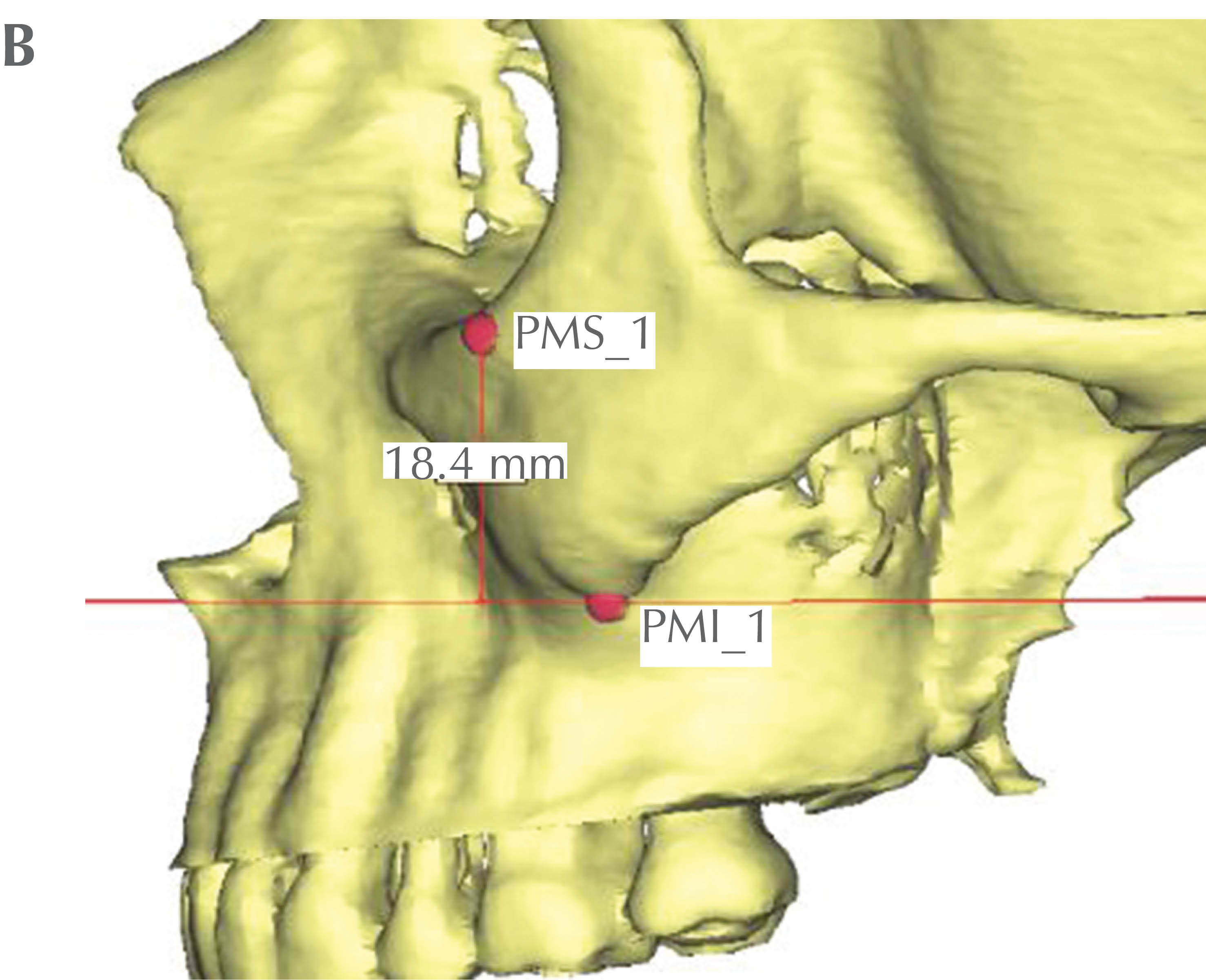 - 40. PMS-PMI: dimensión vertical malar; distancia entre los puntos de la prominencia malar superior (PMS) y el de la prominencia malar inferior (PMI) (Figuras 40A y 40B).