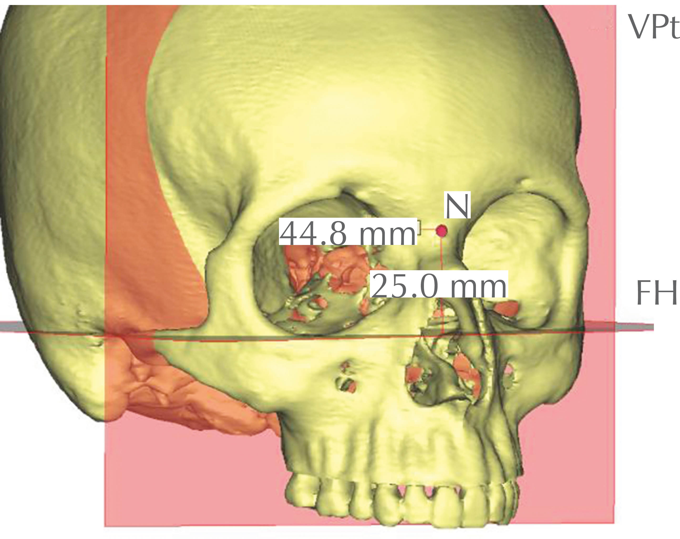 - 44. N-FH: ubicación vertical de nasión (N); distancia entre el punto N y el plano horizontal de Frankfurt (Figura 42).