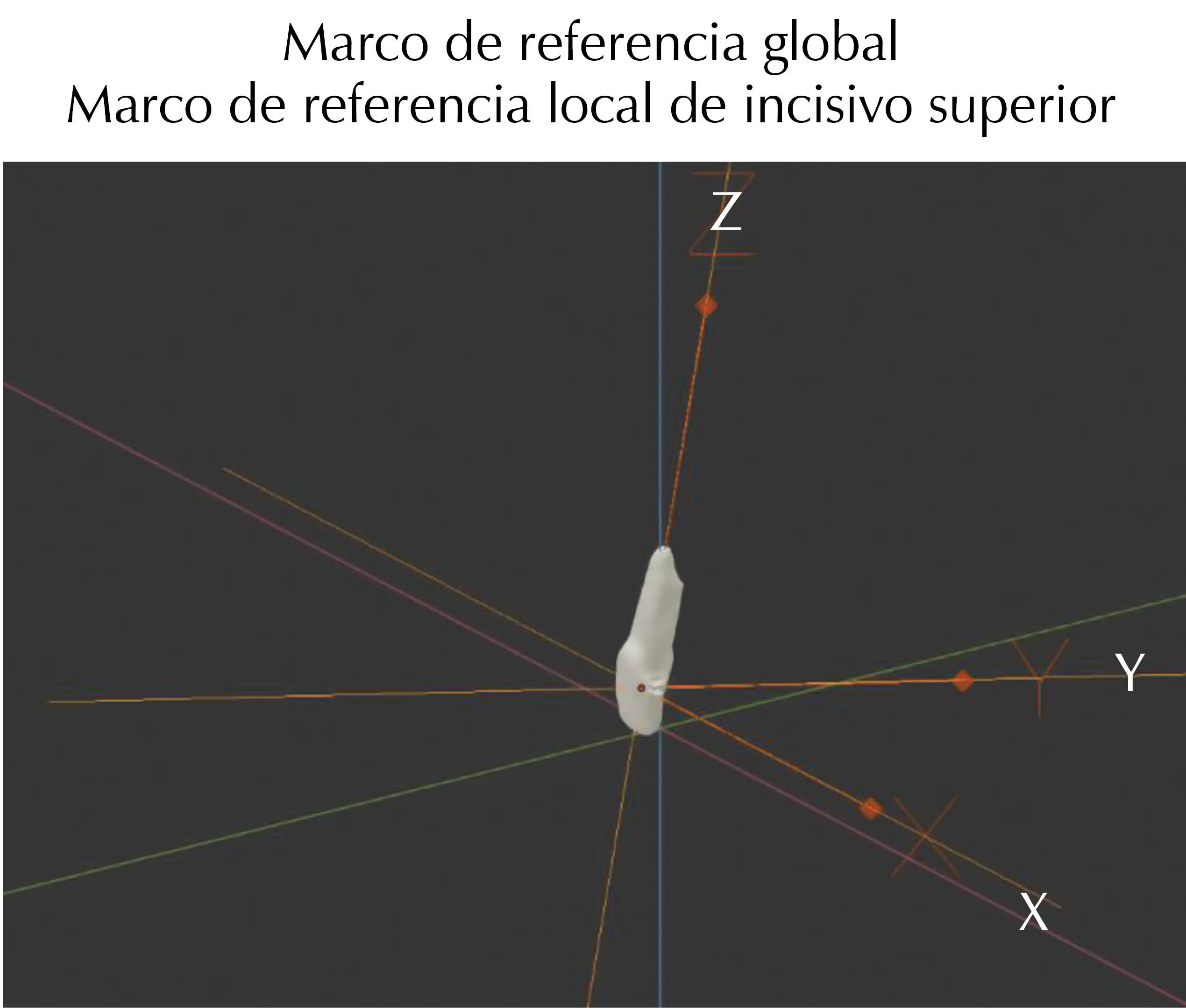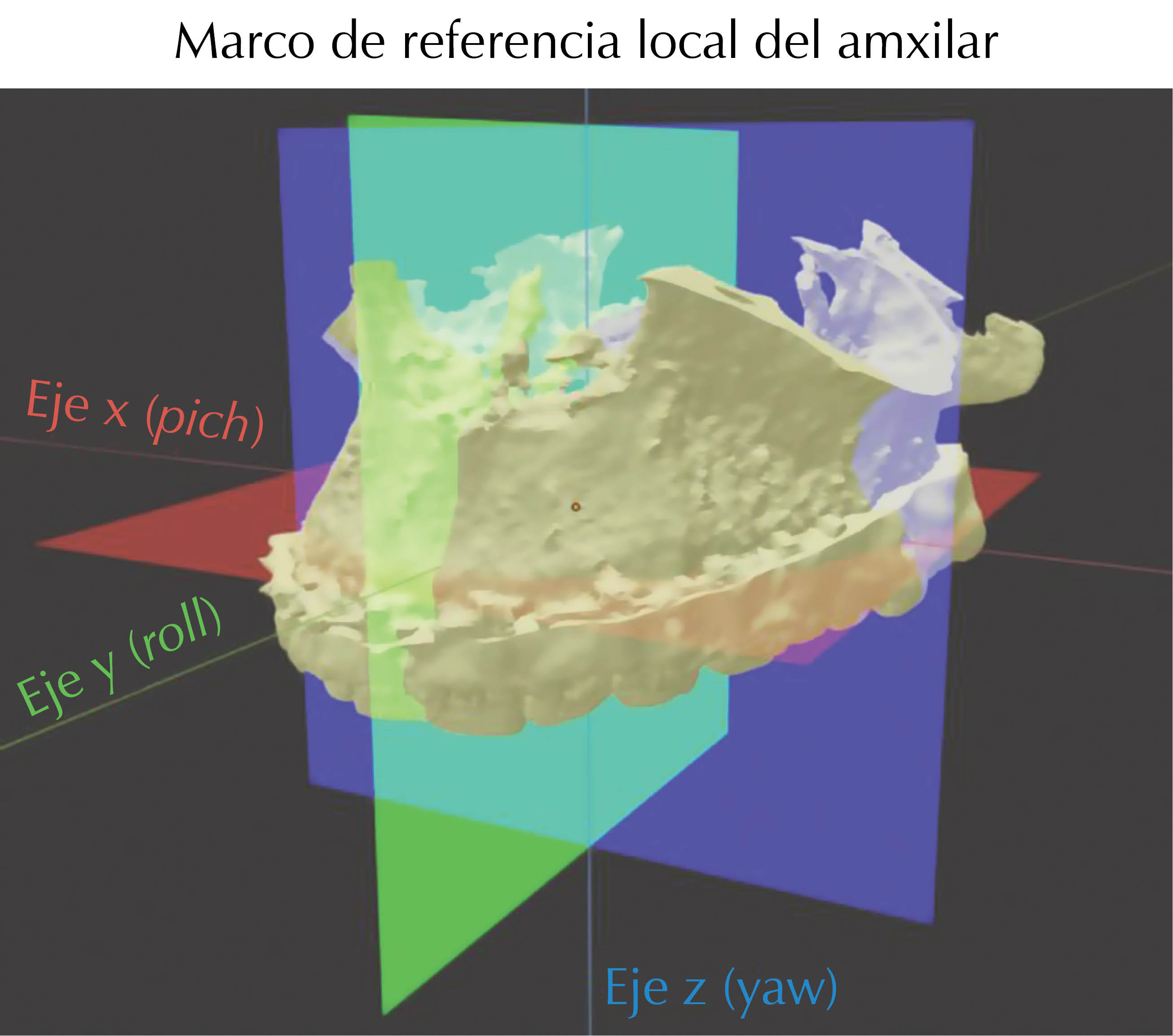 Se utilizan marcos de referencia locales, los marcos de referencia local son para las orientaciones de las subunidades de la cara (maxilar, mandíbula, mentón, incisivo superior, etc.). Sirven para deducir la orientación de las subunidades de la cara con respecto al marco global (Figuras 5 y 6).