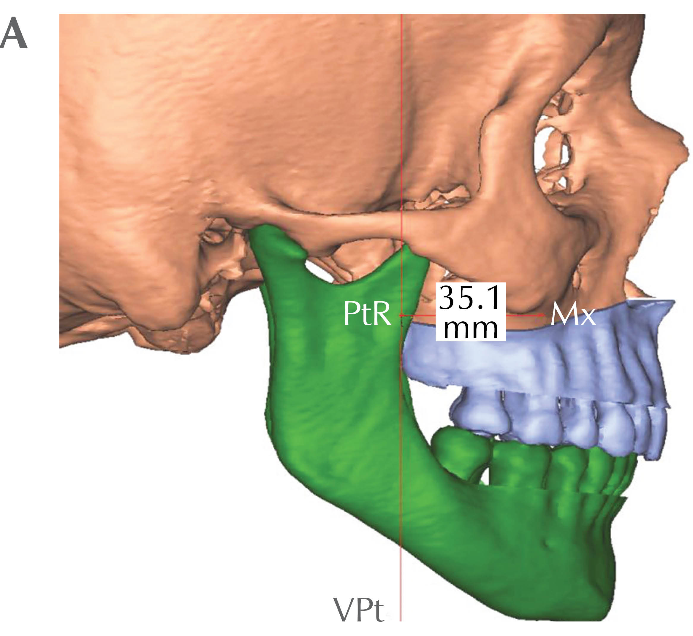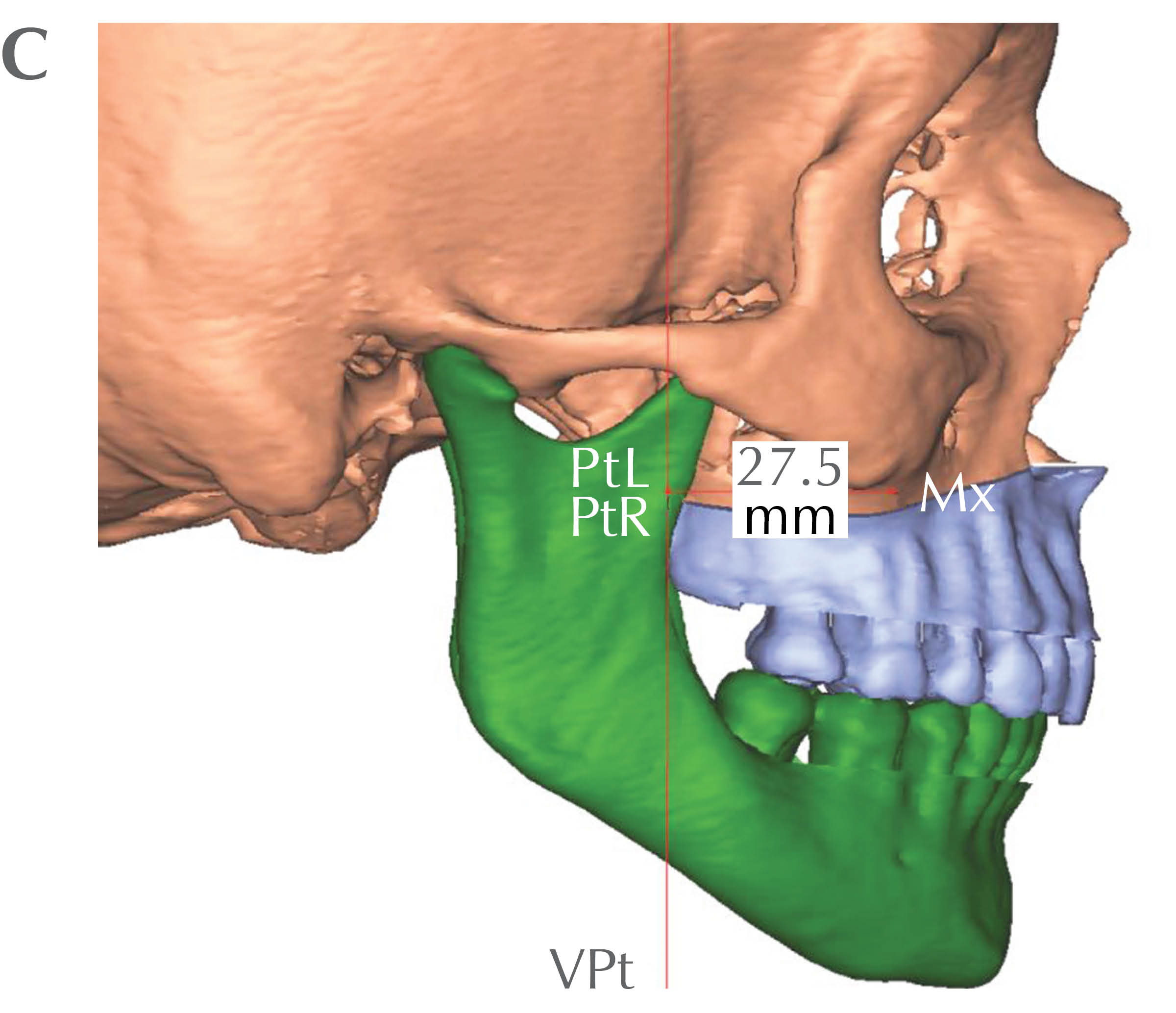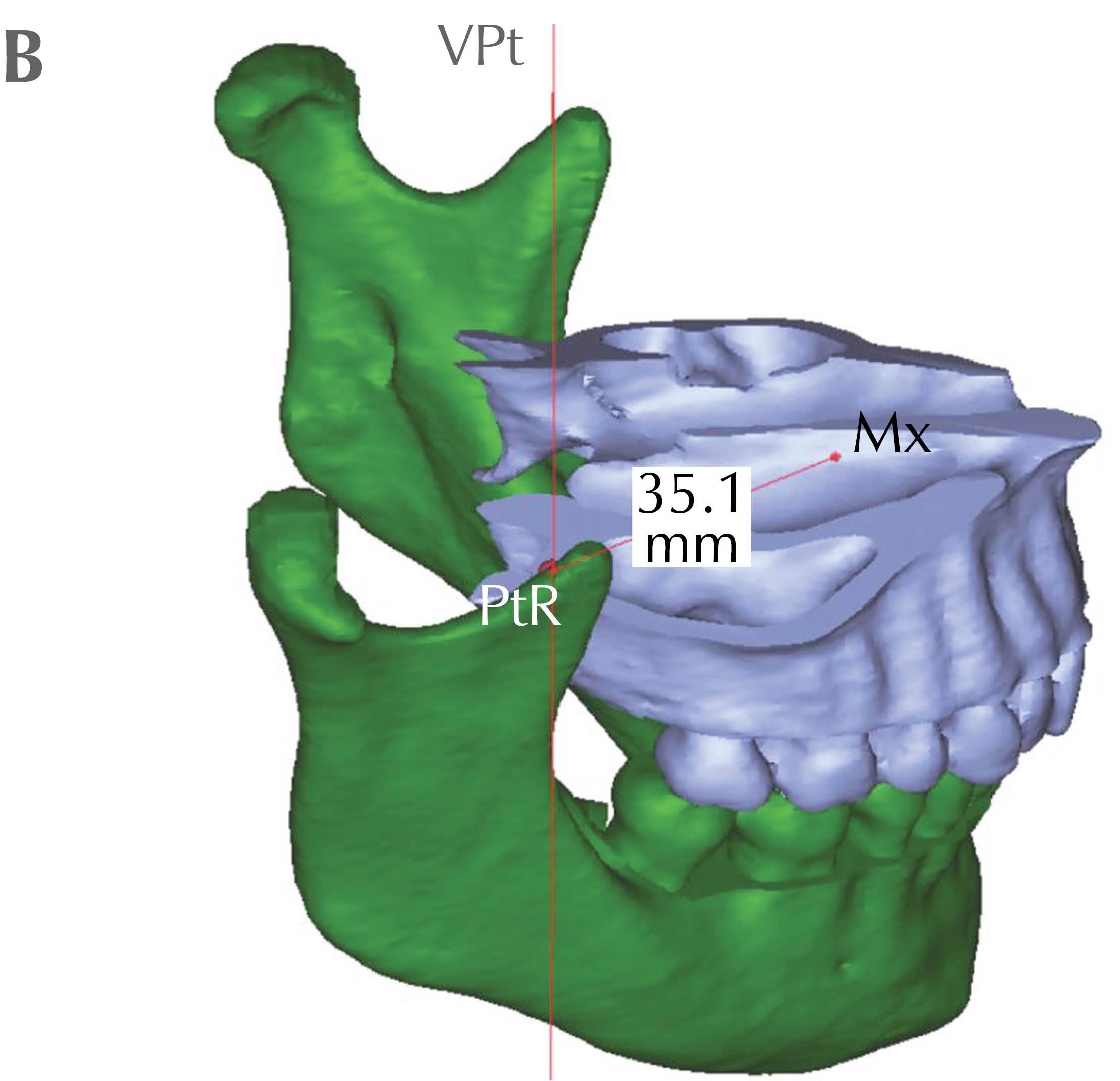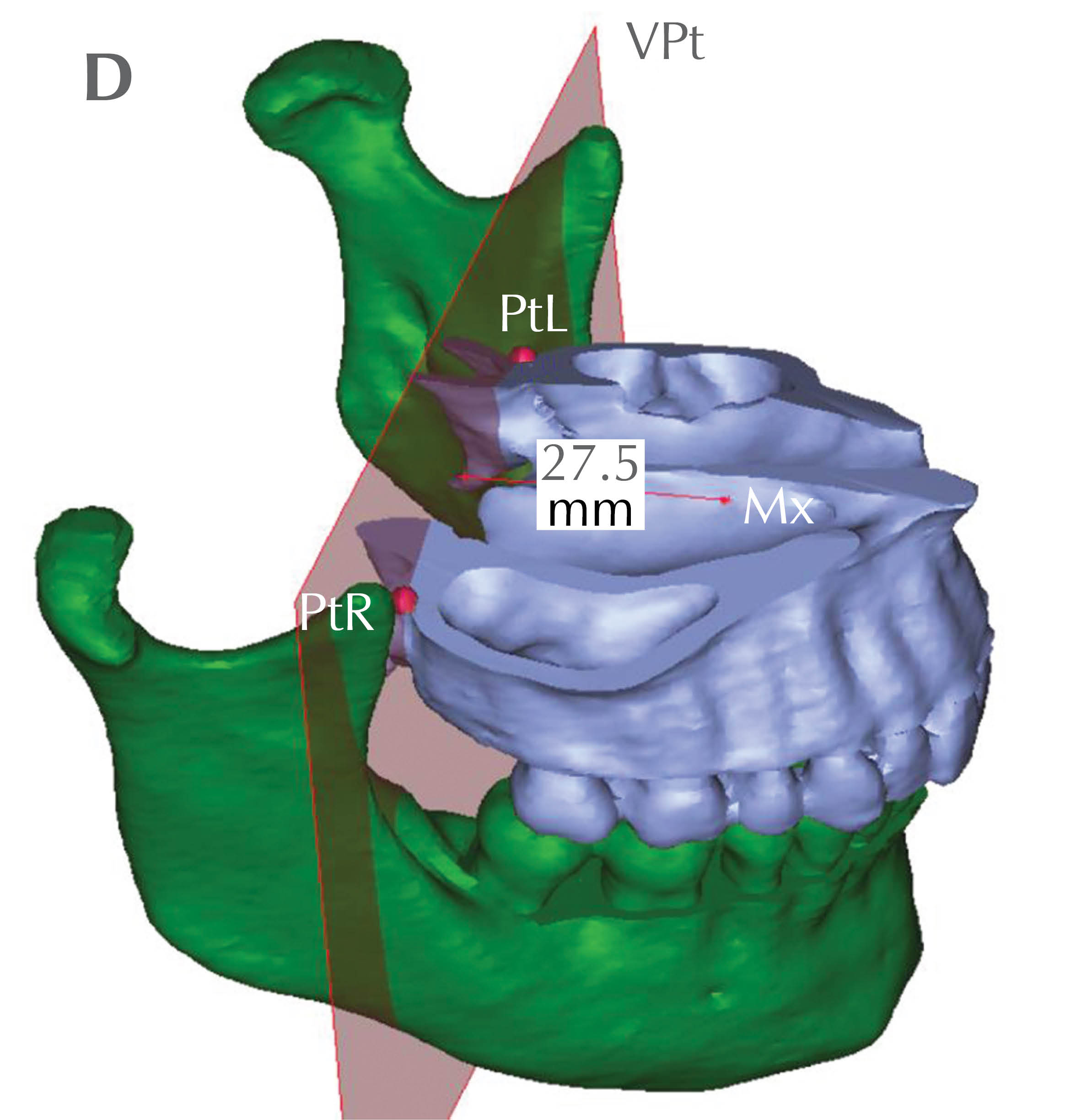 Para ejemplificar algunas de las cuestiones que debemos tener en cuenta para que nuestras mediciones sean correctas, hablaremos de las distancias entre dos puntos, entendiendo que una línea recta, por definición es el segmento de una sucesión de puntos en el espacio, entonces una medida cefalométrica entre un punto y una línea se convierte en la distancia entre un punto cefalométrico determinado y un punto de la sucesión de puntos que forman esa línea, en cefalometría 2D no tienen mayor relevancia este aspecto, pero el ejemplo de las Figuras 7A, 7B, 7C y 7D se observa cómo se deben hacer las mediciones. En este ejemplo medimos la distancia entre el punto Mx (maxilar: punto equidistante entre la espina nasal anterior y la espina nasal posterior) y la vertical pterigomaxilar (Mx-VPt) del autor Trujillo. En cefalometría 2D generamos una vertical que pase por el punto VPt (el punto más inferior de la fisura pterigomaxilar) y medimos la distancia entre el punto Mx y un punto de esta vertical en línea recta horizontal (Figuras 7A y 7B). En cefalometría 3D tenemos que contemplar el otro eje, ya que las mediciones no sólo pueden ser anteroposteriores o superoinferiores, sino que también mediolaterales. Esto nos estrega mayor precisión a la hora de recolectar datos de los estudios de imagen, pero debemos entender los principios para asegurar que los datos recolectados son los reales, en las Figuras 7C y 7D observamos cómo una distancia desde el punto Mx a un punto central en un plano vertical que pase a través del punto Pt derecho y Pt izquierdo.