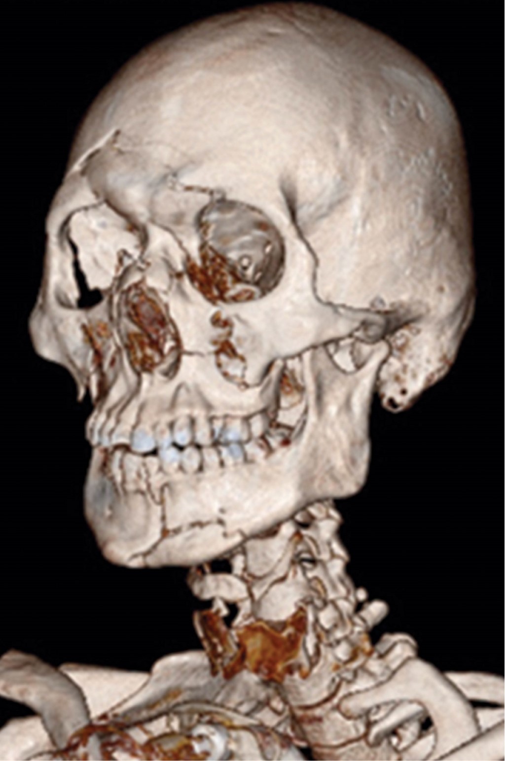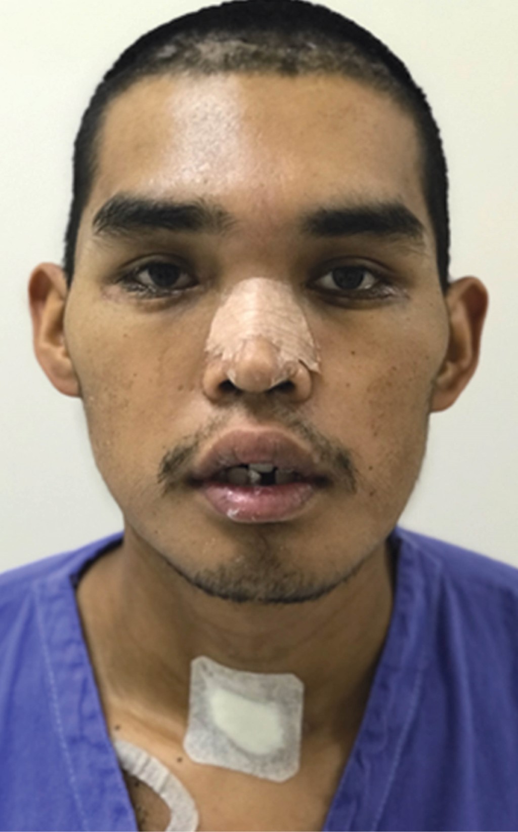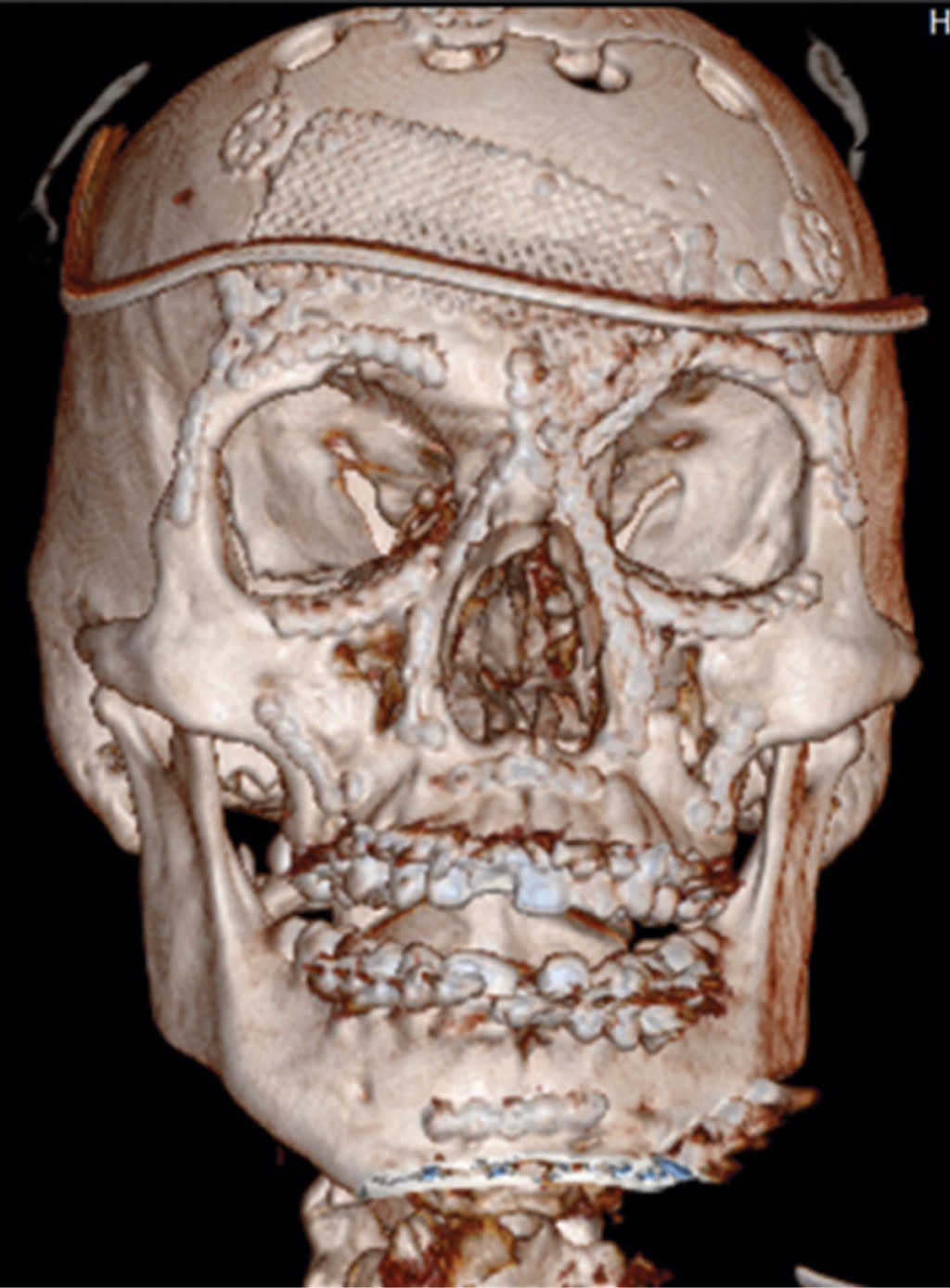 Se reporta el caso de paciente masculino, militar en activo, de 23 años sin antecedentes personales y/o familiares de importancia, que sufre un accidente automovilístico tipo volcadura durante actos del servicio. Mientras se encontraba sentado en una camioneta de transporte militar, sin cinturón de seguridad y con el uso de casco y chaleco, el conductor perdió el control del vehículo, impulsándolo hacia adelante y golpeándose de manera frontal con el asiento tubular de metal de enfrente, golpe que produjo que perdiera la conciencia, posteriormente el vehículo cayó por un voladero, durante esta segunda volcadura fue impulsado fuera del vehículo cayendo sobre una superficie de piedras y pasto, recibió atención de primera instancia y fue trasladado en helicóptero al Hospital Militar Regional de Guadalajara, donde se determinó un diagnóstico de traumatismo cráneo-encefálico moderado, neumotórax y traumatismo facial y se decidió tratamiento consistente en colocación de sonda pleural y traqueostomía. Posteriormente fue transportado en helicóptero al Hospital Central Militar donde pasó directamente a la unidad de cuidados intensivos donde se sedó al paciente y se instauró ventilación mecánica, se colocó catéter venoso central a fin de administrar aminas tipo norepinefrina, cobertura antimicrobiana con cefalosporina de cuarta generación y glucopéptidos y colocación de sonda orogástrica (Figura 1). A la exploración clínica y al estudio de tomografía computarizada de macizo facial se dio un diagnóstico de fractura panfacial consistente en: fractura de pared anterior y posterior del seno frontal de manera bilateral, trazos de fractura Le Fort I, II y III, fractura NOE tipo II, fractura de piso, pared medial y lateral de ambas órbitas, fractura de arco cigomático derecho, fractura sagital palatina, fractura sinfisiaria y en bloque mandibular y fractura de la unión del asta mayor izquierda con el cuerpo y del asta mayor derecha del hueso hioides. Al cuarto día del traumatismo se realizó tratamiento médico quirúrgico consistente en craneotomía descompresiva y cranealización de ambos senos frontales por parte del Servicio de Neurocirugía, reducción abierta más fijación rígida con material de osteosíntesis de fractura panfacial + reconstrucción de órbitas con mallas de titanio + cantopexia del ligamento cantal derecho por parte del Servicio de Cirugía Oral y Maxilofacial del Hospital Central Militar. La fractura del hueso hioides se manejó de manera conservadora con traqueostomía, sonda orogástrica y collarín cervical (Figuras 2 a 4). Actualmente el paciente se encuentra ubicado en las tres esferas de conciencia, con movimientos oculares y agudeza visual conservada, oclusión estable, sin dificultad al habla y deglución, con valoración endoscópica por parte de la especialidad de foniatría, estado que le permitirá regresar a su servicio laboral sin restricción alguna (Figuras 5 y 6).