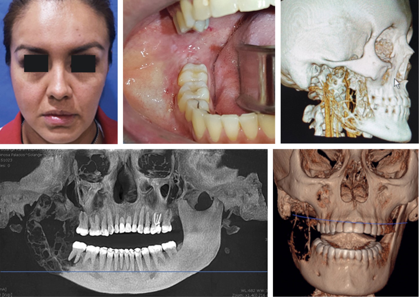 La paciente inicia padecimiento en el mes de junio de 2012 cuando al bostezar refiere dolor intenso en región de la ATM del lado derecho, por lo que acude a facultativo particular, quien realiza extracción de terceros molares sin complicaciones, posteriormente en el mes de agosto de 2012 inicia tratamiento de ortodoncia por dolor de ATM crónico, concluyendo dicho tratamiento en abril de 2015. Sin embargo, al finalizar tratamiento de ortodoncia, refiere continuar con sintomatología dolorosa aguda en ATM de predominio del lado derecho, por lo que decide acudir a facultativo, quien indica tratamiento a base de antiinflamatorios; sin embargo, durante agosto de 2015 continúa con evolución desfavorable, decidiendo acudir a médico homeópata, quien solicita estudio de imagen y por hallazgo radiológico observa lesión en cuerpo y rama mandibular de lado derecho, enviando a cirujano maxilofacial particular en noviembre de 2015, quien realiza biopsia incisional, y al no obtener un diagnóstico concluyente por reporte de histopatología, decide referir a seguridad social, iniciando protocolo correspondiente en nuestra unidad.