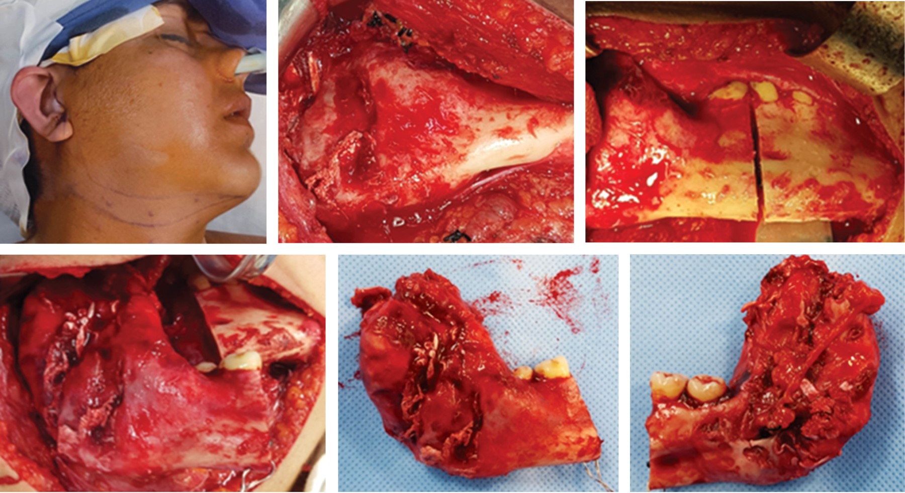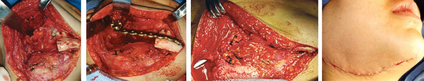 Previo protocolo de asepsia y antisepsia y posterior colocación de campos estériles, entra paciente a sala en decúbito dorsal, bajo anestesia general balanceada por intubación orotraqueal se procede a realizar infiltración en región submandibular derecha, a base de lidocaína al 2% con epinefrina al 1 × 100,000 con fines hemostáticos y de hidrosección, se inicia abordaje submandibular derecho tipo Risdon con extensión a región submentoniana para después efectuar disección por planos hasta encontrar plano óseo, se realiza marcaje de osteotomía determinando 1 cm de margen libre de lesión a nivel de segundo premolar inferior derecho, posteriormente se efectúa disección de elementos vasculares y nerviosos de la región mandibular para efectuar resección en bloque de cuerpo y rama mandibular del lado derecho. Por último se procede a colocar y adaptar placa de reconstrucción sistema 2.4, con aditamento condilar derecho, previamente conformada con estudio de estereolitografía, se fijan tres tornillos bicorticales sistema 2.4 en borde basal mandibular, posteriormente al observar adecuada estabilidad, se procede a cierre por planos y posterior cierre de piel con sutura subdérmica, concluyendo procedimiento quirúrgico sin complicaciones (Figuras 2 y 3).