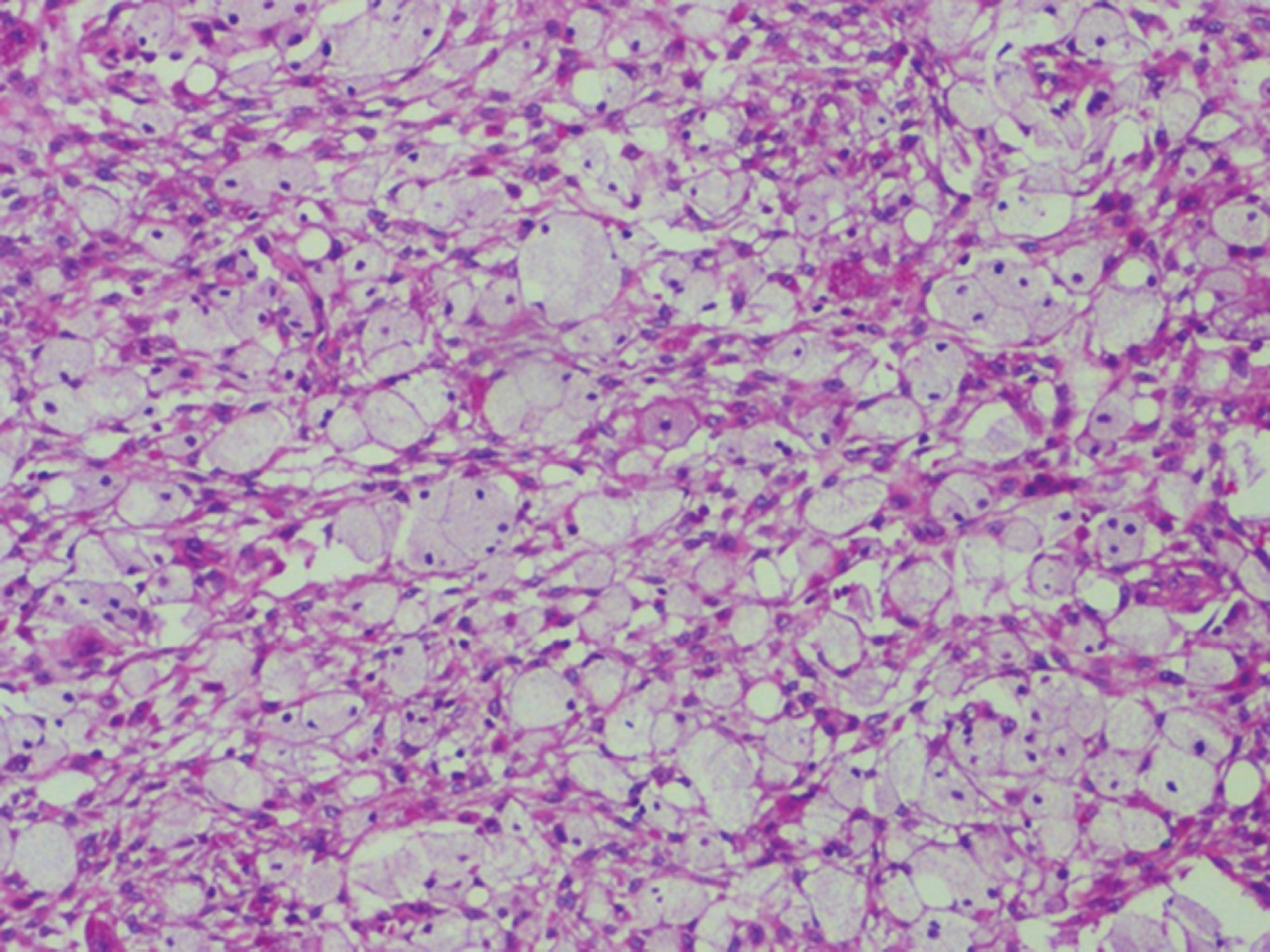 El espécimen está constituido por células xánticas dispuestas en grupos así como células histiocíticas dispuestas en remolinos en un estroma de tejido conectivo fibroso bien vascularizado, con presencia de infiltrado inflamatorio crónico (Figura 4).