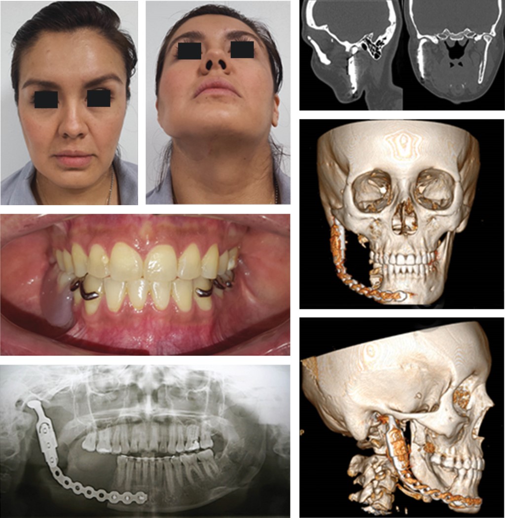Actualmente la paciente cuenta con un seguimiento a un año, sin detectar ningún tipo de recidiva, clínica o tomográfica. Por otra parte, la opción de reconstrucción inmediata con placa de reconstrucción y aditamento condilar, así como su posterior rehabilitación mediante prótesis maxilofacial, cumple con las expectativas estéticas y funcionales necesarias para la realización de sus funciones esenciales. Con el reporte de este caso se pretende motivar a diversos autores a publicar sus experiencias quirúrgicas de tratamiento con respecto a este tipo de lesiones que hasta el momento son extremadamente raras en los huesos maxilares.