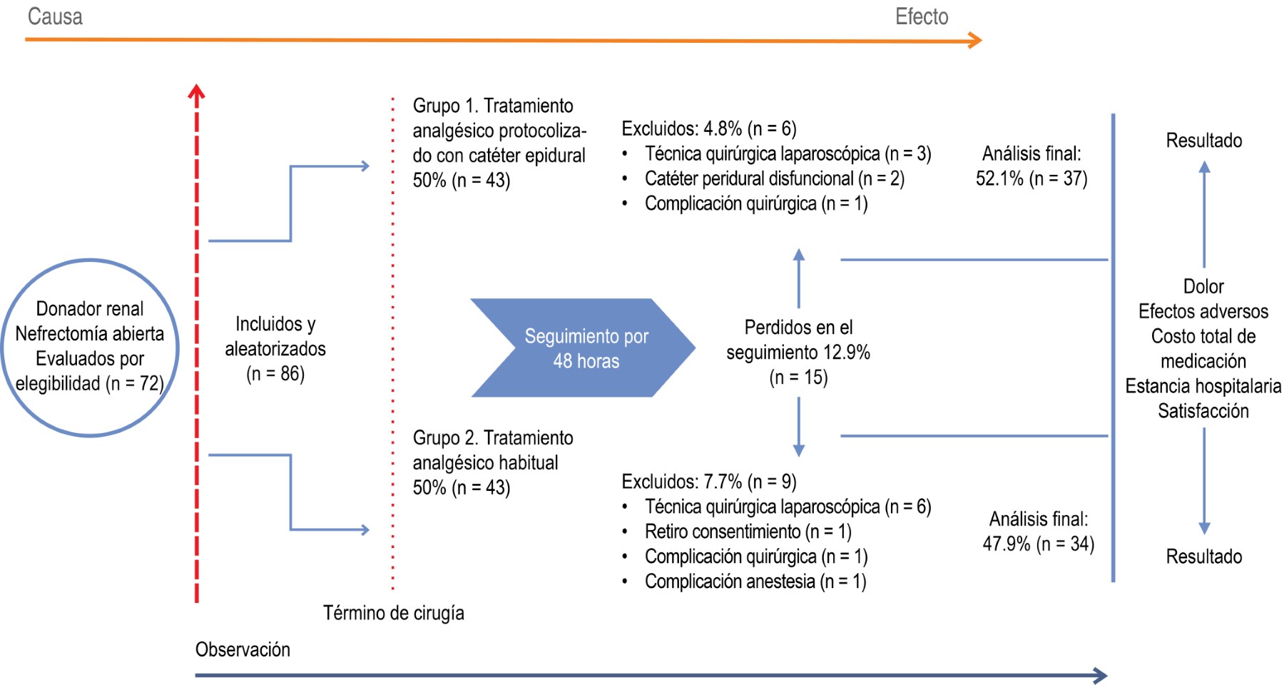Se realizó un estudio de costos usando un modelo de ensayo clínico controlado, aleatorizado, ciego simple. Usamos este modelo, ya que así exploramos variables de resultado secundarias relacionadas a la analgesia y la satisfacción. Una vez que se contó con el consentimiento informado y la evaluación clínica basal se realizó una aleatorización y con el mecanismo de la tómbola los participantes fueron asignados para recibir: a) analgesia protocolizada durante 48 horas con ropivacaína vía catéter epidural al 0.125%(25) + metamizol 1 g IV cada 8 horas + paracetamol 1 g vía oral cada seis horas, a cargo del Servicio de Medicina del Dolor del hospital, o bien; b) tratamiento analgésico habitual o convencional de acuerdo a la indicación de los médicos tratantes en la Unidad de Trasplante Renal. Este último constó del uso de uno o más antiinflamatorios no esteroideos tipo ketorolaco, metamizol y clonixinato de lisina, alternados y/o combinados. En este mismo grupo se empleó infiltración de la herida quirúrgica y se podían indicar o no opioides tipo tramadol o buprenorfina como analgesia de rescate a consideración de los médicos del Servicio de Trasplantes.