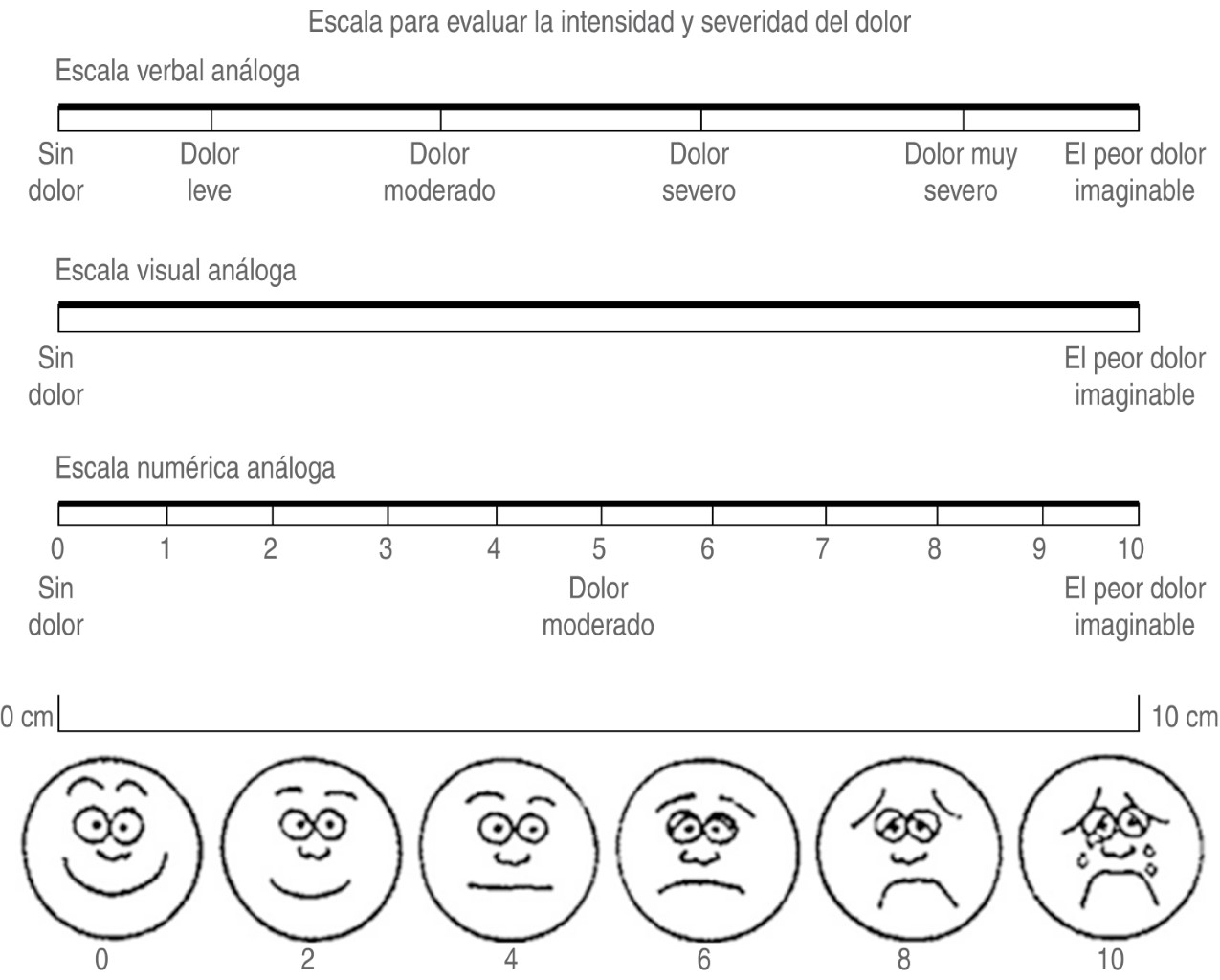 La evaluación cualitativa y cuantitativa del dolor constituye la mejor herramienta para la evaluación del dolor por el paciente anciano(12). La evaluación de la intensidad del DAPO (cuantitativa) ha utilizado diversas escalas (Figura 1), entre las que se encuentran: