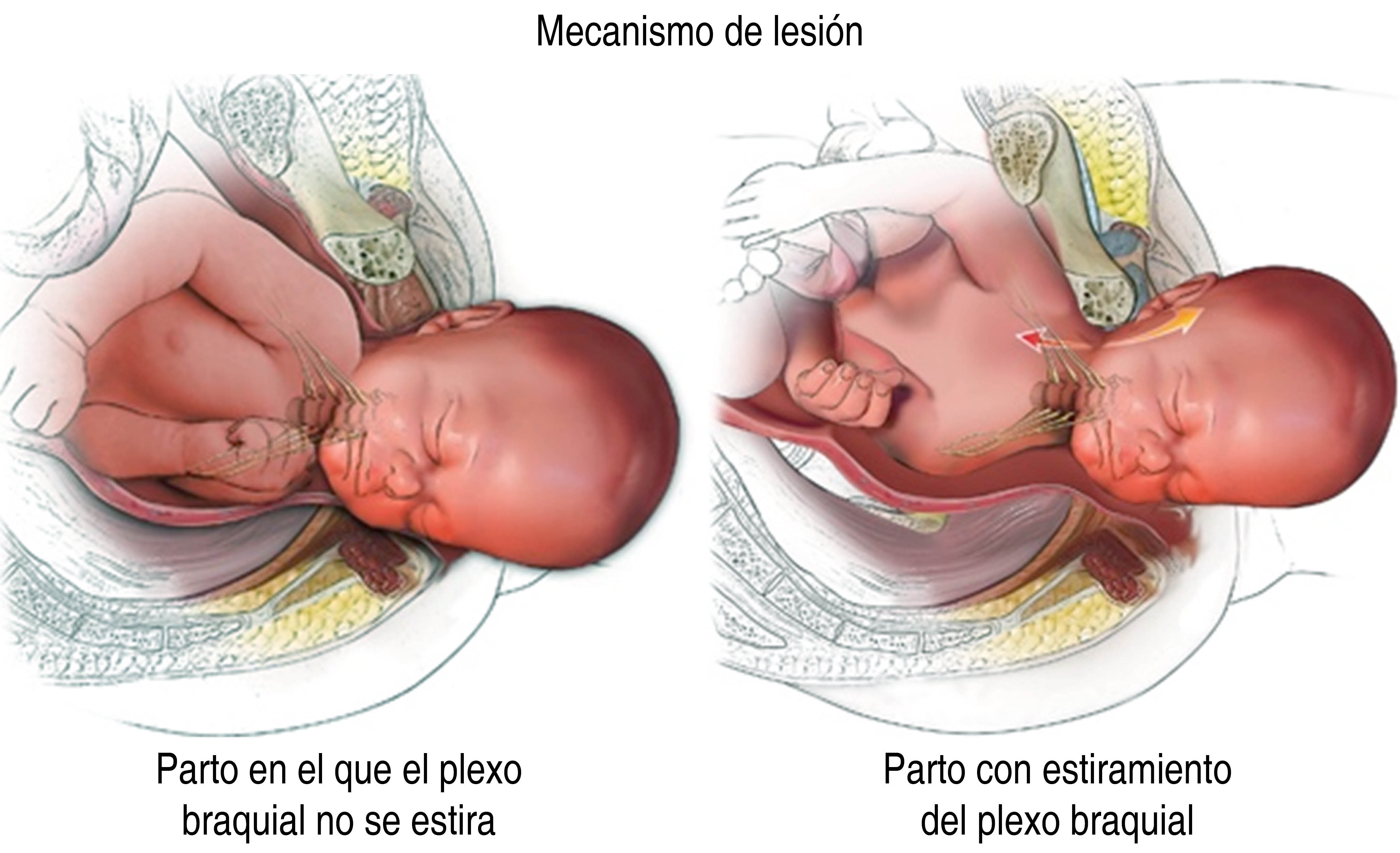 En los recién nacidos, la mayoría de las parálisis del plexo braquial se produce debido al alargamiento del plexo braquial durante el parto al separar la cabeza con fuerza del hombro (Figura 3); sin embargo, existen casos documentados de esta lesión sin tracción de la cabeza fetal, y varios autores se han opuesto al término "parálisis obstétrica" debido, entre otros factores, a los avances en la obstetricia moderna.