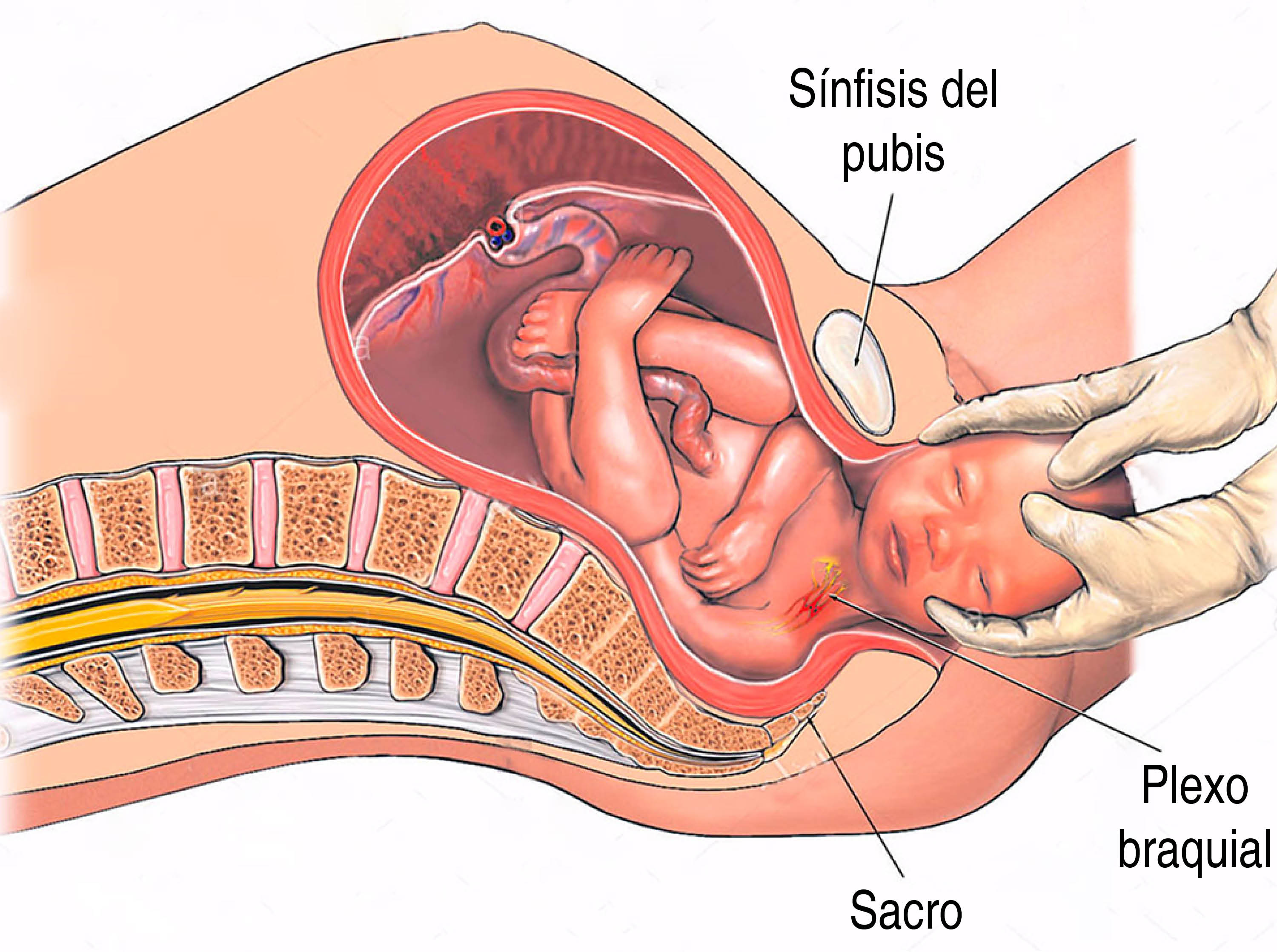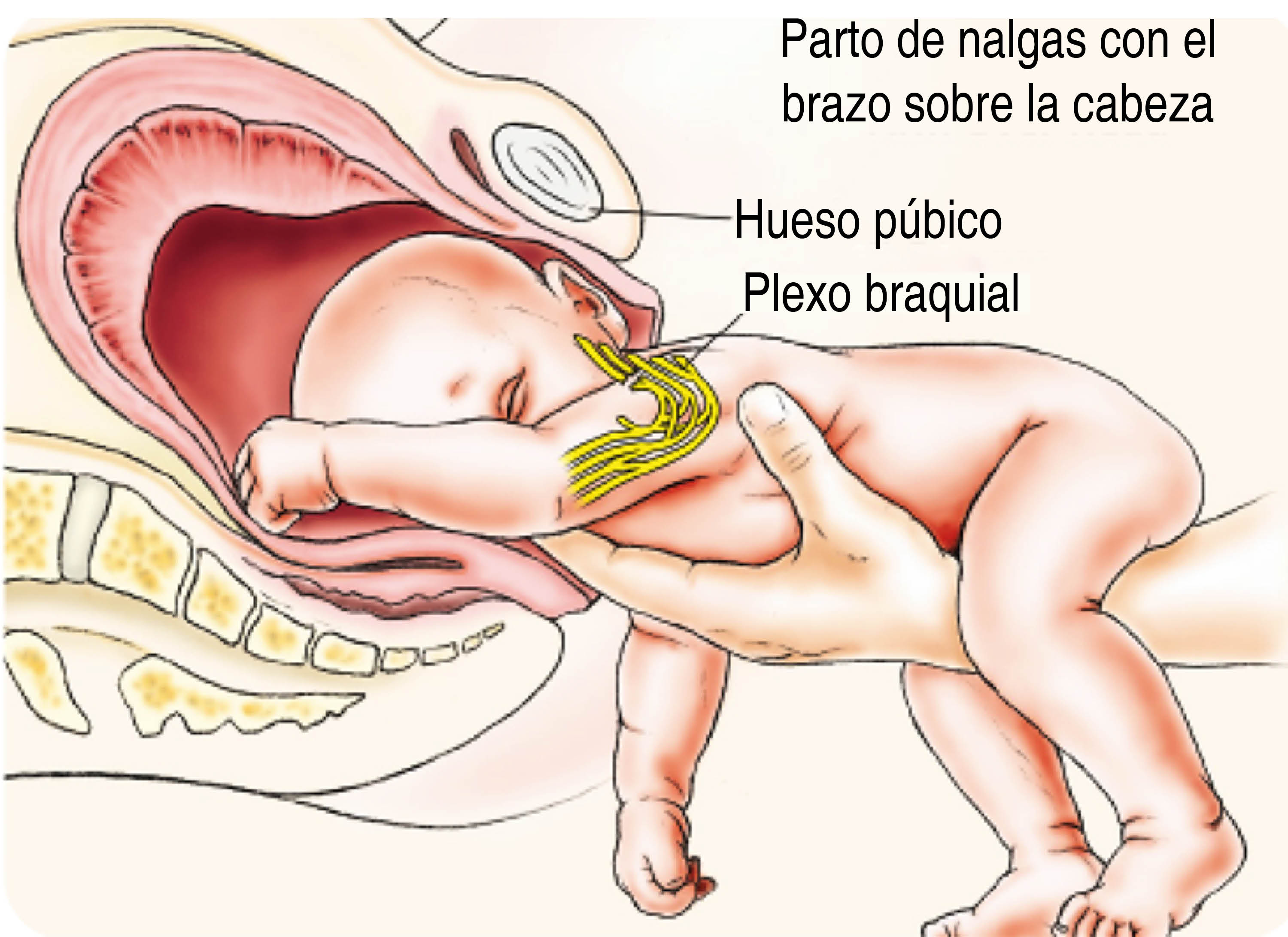 - • Parto prolongado. Las fuertes contracciones uterinas y las fuerzas maternas de empuje pueden comprimir y elongar el plexo braquial, no necesariamente dadas por la fuerza generada por el operador del parto. Estudios de ingeniería matemática y biomédica demuestran que las fuerzas endógenas (contracciones uterinas-esfuerzos maternos de empuje) pueden generar lesión en el plexo braquial.