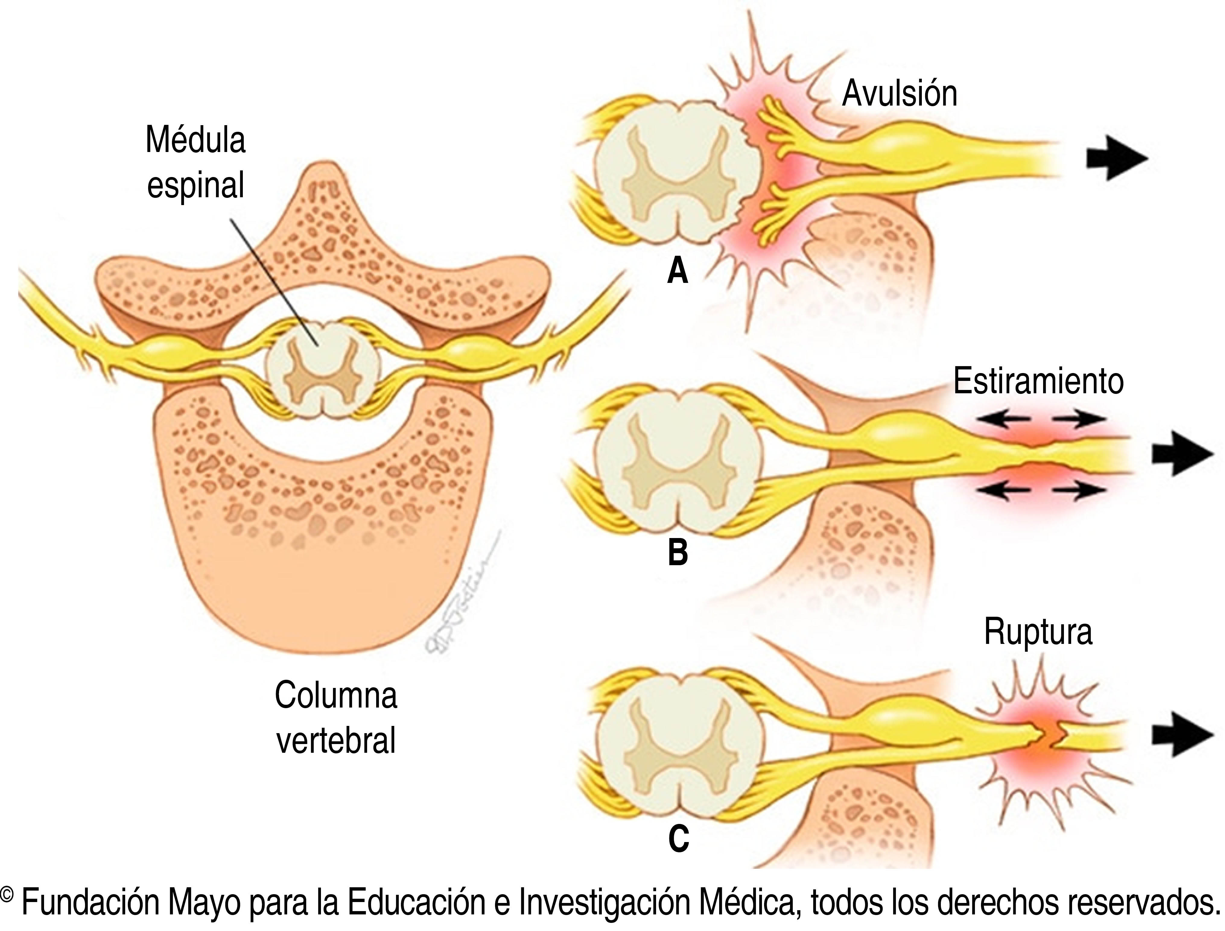 El tipo de lesión nerviosa más grave es la avulsión (A), que se produce cuando las raíces nerviosas se desprenden de la médula espinal. Las lesiones menos graves consisten en un estiramiento (B) de las fibras nerviosas o una ruptura (C), que se produce cuando el nervio se rompe en partes separadas (Figura 8).