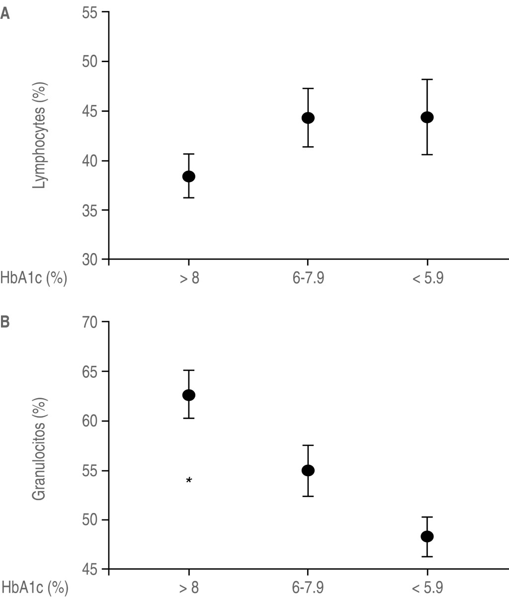 La glucemia no controlada ha demostrado deterioro de las defensas del huésped, incluida la disminución de la actividad y la movilización de leucocitos granulocitos, la quimiotaxis, la actividad fagocítica y el aumento del estrés oxidativo, que afectan el sistema metabólico, genético y hemodinámico, e incrementa los productos finales de glicación avanzada,28,32,33 lo que demuestra que el número de granulocitos en la sangre en individuos conlleva riesgo a desarrollar complicaciones. Esto nos sugiere que el proceso inflamatorio generado por los niveles altos de HbA1c está favoreciendo el incremento de estas células para exacerbar la respuesta inmunológica. Sin embargo, estudios han demostrado que el aumento de los niveles de glucosa en sangre disminuye la capacidad de activación de los granulocitos. Sugieren que el control glucémico deficiente en pacientes con DMT2 disminuye la capacidad de defensa y remodelación en el tejido periodontal.