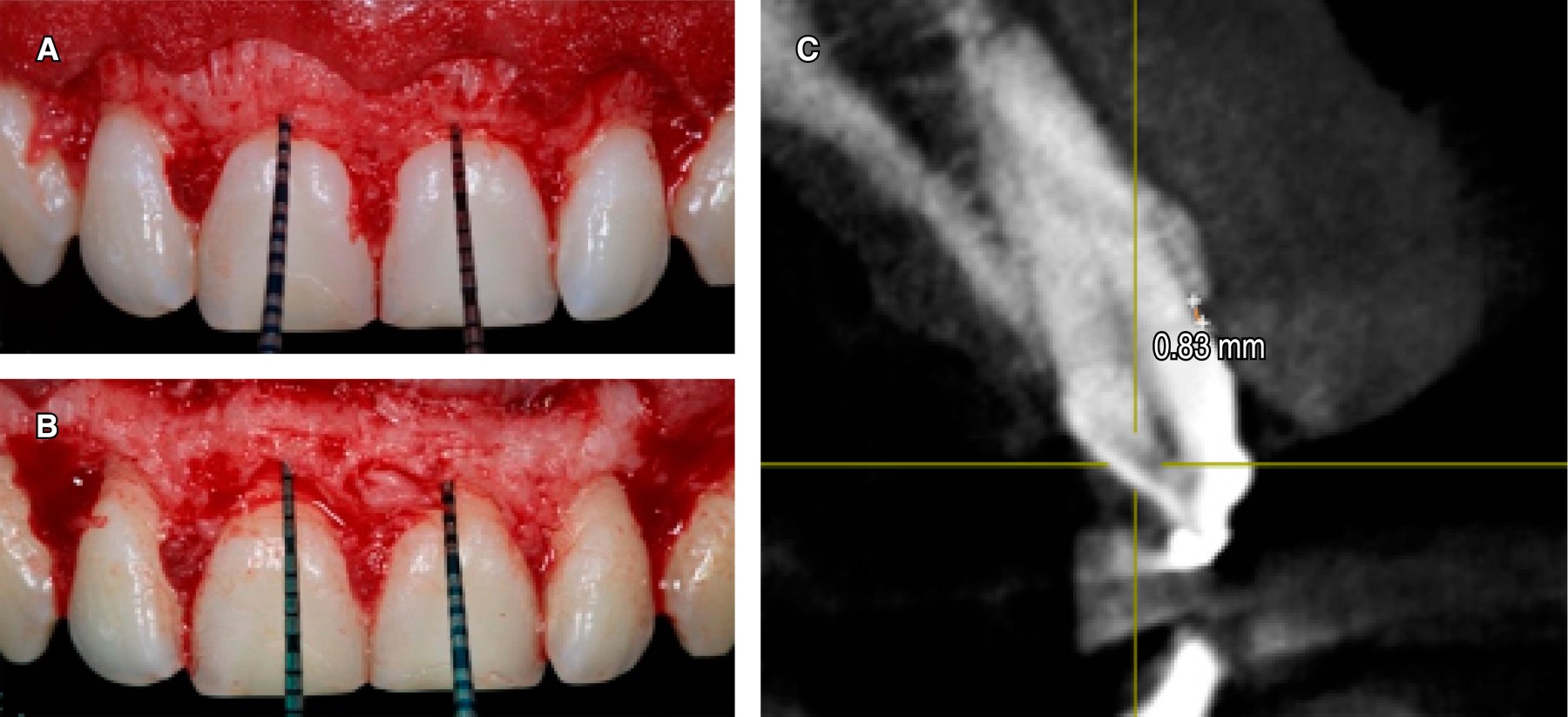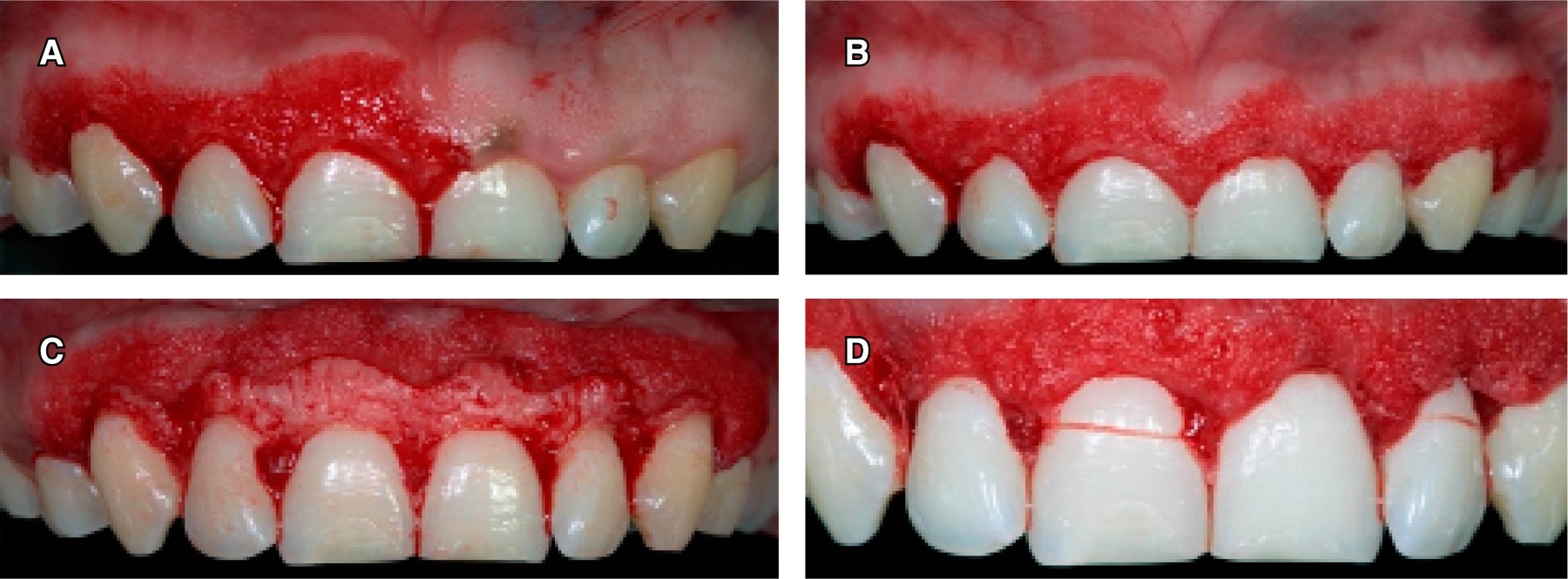 A continuación, con una sonda periodontal se marcó con puntos sangrantes la encía en la zona vestibular (según los datos obtenidos de la CBCT) de todos los dientes a tratar, en seguida se realizó una gingivectomía con una incisión a bisel interno con una hoja de bisturí No. 15c siguiendo el festoneo natural de la encía, y una incisión intracrevicular e incisión interdental; después se realizó una gingivoplastia a bisel interno con bisturí de Kirkland para disminuir el grosor de la encía insertada queratinizada y favorecer la posición de encía marginal con respecto a los cuellos de los dientes (Figura 4 A y B). Se elevó un colgajo de espesor total (Figura 4C), se tomaron las medidas de la corona anatómica y se procedió a medir de la distancia de la cresta ósea a la UCE, corona clínica real, corona anatómica con la sonda periodontal (para así poder comparar los resultados obtenidos con CBCT). Por último, el colgajo se reposicionó y suturó con una técnica de sutura suspensoria, con hilo de sutura de ácido poliglicólico (VICRYL) de 4-0 (Figura 4D).