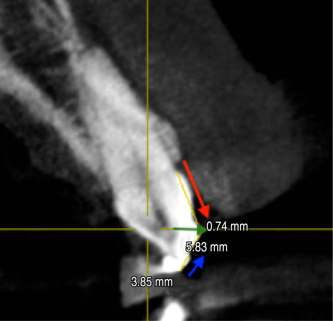 Según el Dr. Claverson O. Silva y colegas en 2015, el tratamiento de erupción pasiva alterada debe tener como objetivo lograr la reducción de exceso de tejido gingival (restablecimiento del margen gingival de 1 a 2 mm por arriba o a nivel de UCE y aumentar la longitud de la corona clínica), el equilibrio de los contornos gingivales y el restablecimiento de tejido supracrestal insertado (ancho biológico).15 De la misma forma, en este estudio se consideraron los parámetros de eliminación correcta de tejido gingival, tamaño de corona clínica, longitud de la cresta ósea a UCE que fueron valorados previamente con CBCT y dieron la ventaja de no invadir más allá de los límites establecidos.