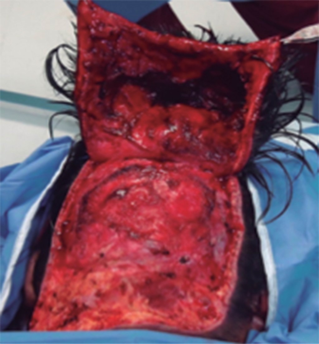 Se colocó un expansor tisular liso rectangular de 15 × 7.5 cm, de 750 mL de volumen (Silimed 810-720-3), con válvula remota en la región frontoparietal y llenado transoperatorio de 40 mL, por medio de incisión de 4 cm perpendicular al eje del expansor, 10 cm arriba del borde superior de la lesión, a nivel de la región parietooccipital. A los 30 días de la colocación del expansor se iniciaron infiltraciones semanales de 75 mL hasta alcanzar un volumen de 800 mL (Figura 2).
