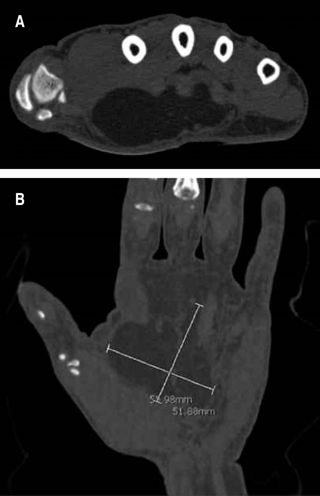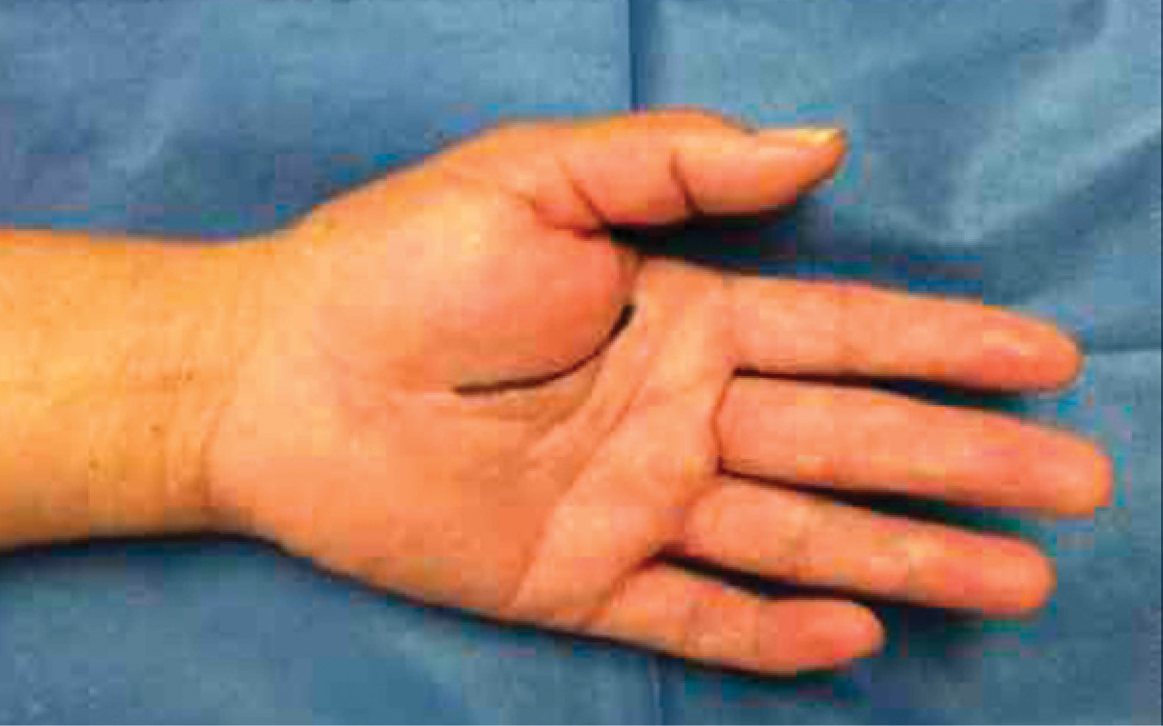 Paciente femenino de 53 años con presencia de masa tumoral de crecimiento lento de un año de evolución en la superficie tenar de la mano izquierda. A los seis meses presentó alteraciones de la flexión, seguida de la pérdida de fuerza del primer y segundo dedo, con caída de objetos de la mano, así como presencia de parestesias en territorio del nervio mediano, las cuales eran incapacitantes para realizar sus actividades diarias, motivo por el que acudió con médico familiar, quien la refirió al Servicio de Cirugía Plástica y Reconstructiva.