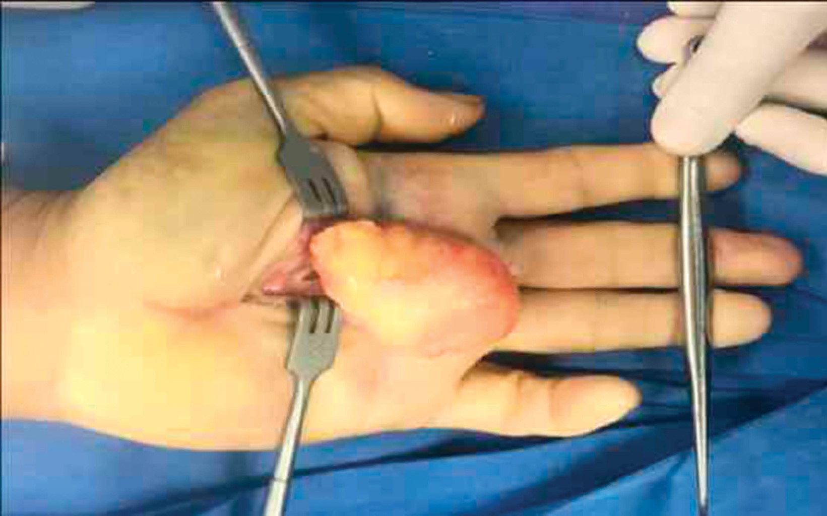 En cuanto al tratamiento, las lesiones asintomáticas pequeñas que han sido diagnosticadas por la historia y el examen físico pueden observarse sin intervención. Sin embargo, la escisión quirúrgica está indicada cuando hay dolor, interferencia con la función de la mano, neuropatía por compresión o preocupación estética.29,41