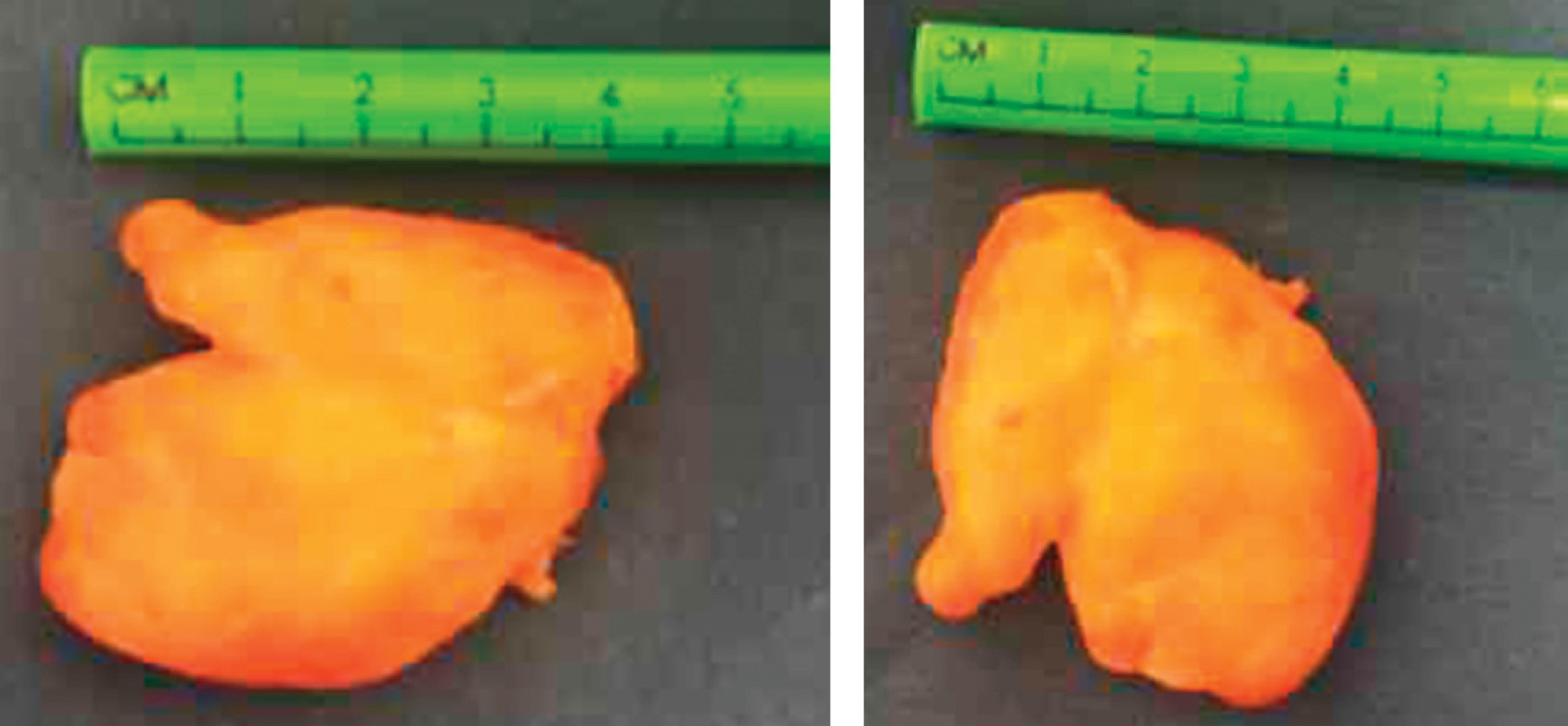 Se realizó electromiografía de la muñeca, la cual identificó aspectos compatibles con lesión marcada del nervio mediano izquierdo. Se decidió efectuar manejo quirúrgico por compresión extrínseca del nervio mediano. Se realizó resección quirúrgica de la tumoración de la eminencia tenar bajo sedación y bloqueo regional con isquemia, encontrando lesión superficial, solitaria, de bordes bien delimitados, redonda, movible, de consistencia blanda, color amarillo, con aspecto homogéneo semejante a tejido adiposo (Figura 3), con una delgada cápsula y medidas de 5 × 5.2 cm (Figura 4). Al realizar la exéresis de la lesión se observó integridad del flexor digitorum y ramas terminales del nervio mediano (Figura 5). Se envió a estudio histopatológico, mismo que reportó lipoma de patrón clásico (Figura 6).