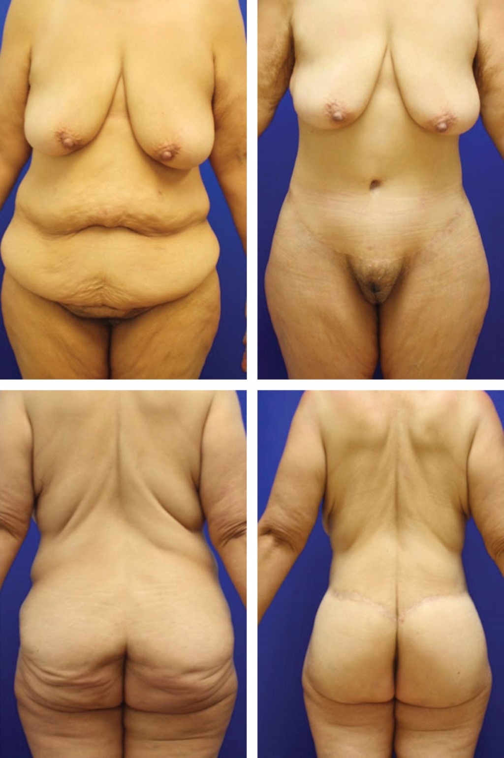 Las técnicas de abdominoplastia tradicionales no logran mejorar el contorno del tronco porque no tratan la laxitud del tejido lateral.28 La abdominoplastia en Flor de Lis o "T invertida" consiste en la resección del exceso cutáneo vertical y horizontal, logrando una reducción notable de la envoltura cutánea.29 La abdominoplastia circunferencial o en cinturón es un procedimiento capaz de manejar toda la circunferencia del tronco inferior, eliminando el panículo adiposo redundante, la ptosis del monte de Venus ayuda a definir la cintura, elevar los muslos y glúteos y eliminar el exceso de tejido posterior30 (Figura 2). No hay un consenso para sugerir que una técnica de abdominoplastia se utilice sobre la otra, e incluso es posible combinar ambas técnicas en casos con gran redundancia cutánea.29,30