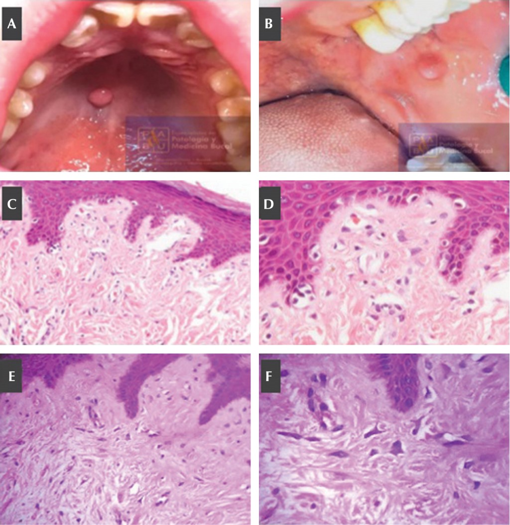 Clínicamente puede tener diversos diagnósticos diferenciales, ya que su apariencia y localización es muy similar a otras (Figura 1). El diagnóstico definitivo se realiza por medio del examen histopatológico, en el cual se espera encontrar tejido conectivo con la característica distintiva que es la presencia de numerosos fibroblastos gigantes, estelares, mononucleados o binucleados, en forma de mantarraya, dentro de la lámina propia superficial.2,10