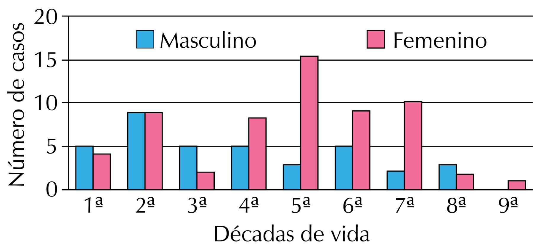 El mayor número de casos se presentó en la segunda década de vida para el sexo masculino, en la quinta para el femenino y para ambos sexos en la segunda en comparación con la literatura que establece la presencia de la lesión en las primeras tres décadas de vida con 60% de acuerdo con Weathers,1 Houston,11 Campos12 y Neville2 mientras que Bakos17 y Kuo9 refieren un mayor número de casos en la tercera y quinta década.