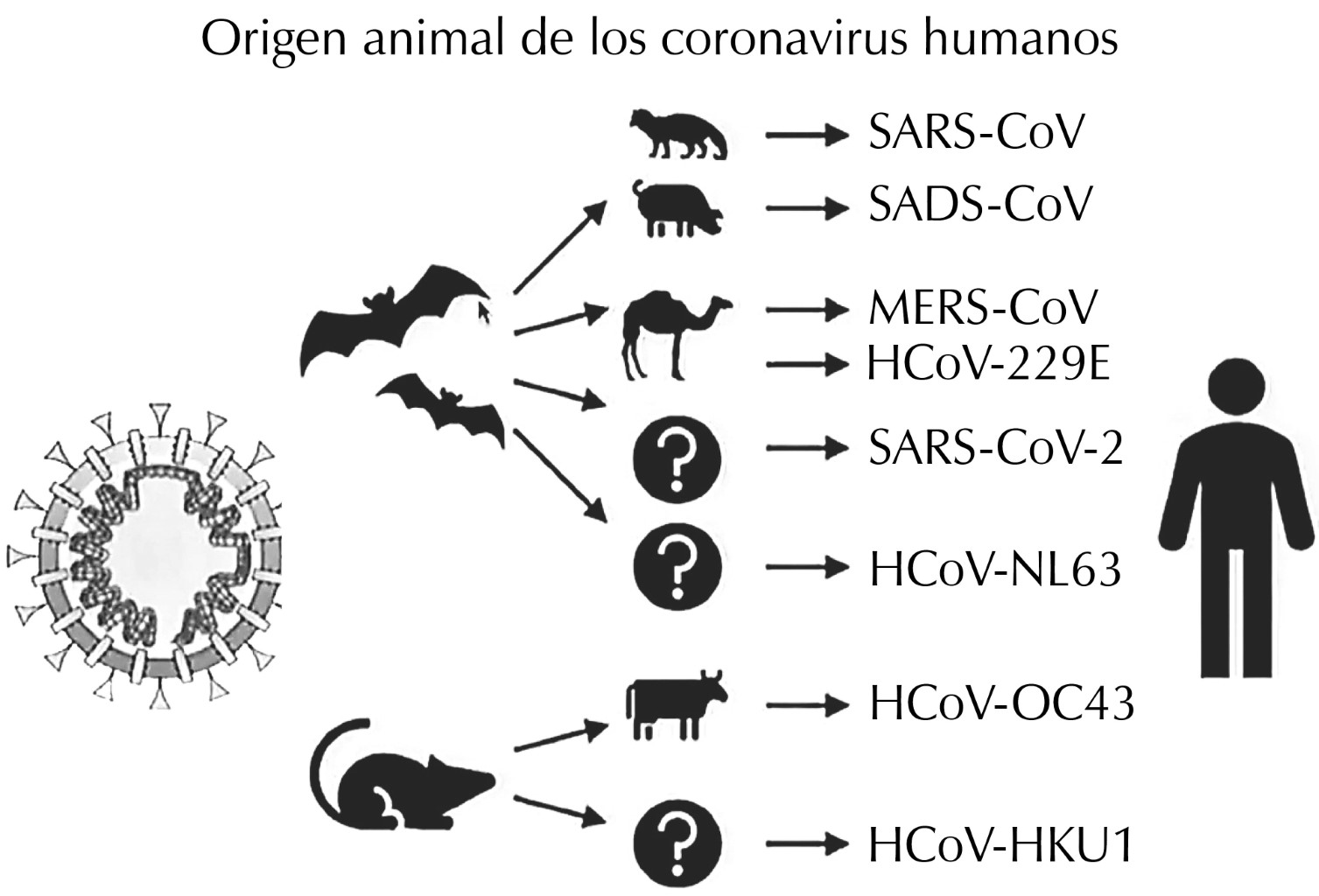En los últimos 25 años, hemos tenido un embate de varias enfermedades causadas por virus y que han afectado a grandes grupos de poblaciones; ahora se produjo una pandemia por el virus SARS-CoV-2 que es de la familia de los coronavirus y está presente en animales, en los cuales no ocasiona enfermedad, pero cuando ha pasado al ser humano sí ha llegado a ocasionar graves enfermedades como el MERS, el SARS, CoV8 y la que ahora está presente, COVID-19 (Figura 5).