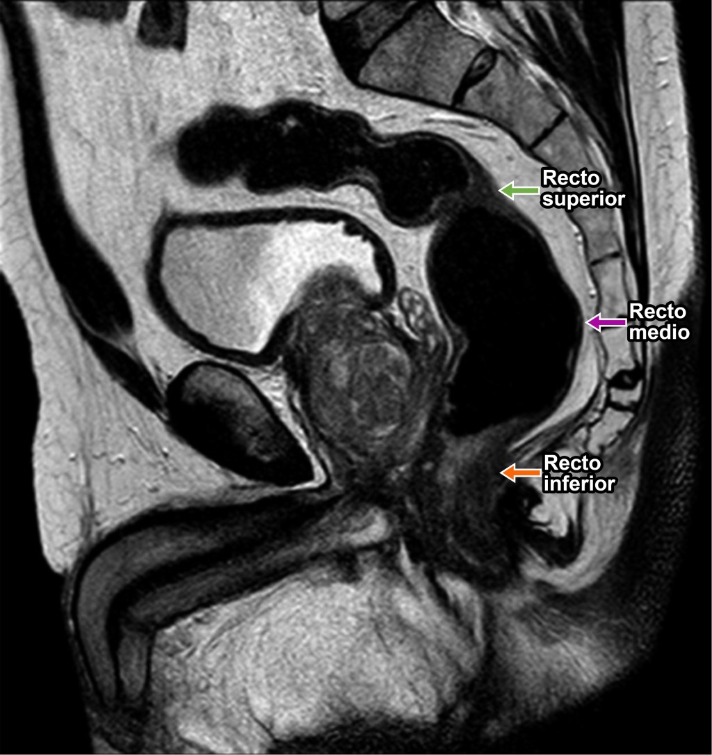 Estos pacientes presentan un alto riesgo de recurrencias locales pélvicas tras la resección quirúrgica, de 30 a 40% recurren dentro de los primeros dos a tres años. El éxito del tratamiento va a depender en gran medida de la obtención de un margen libre de tumor, el llamado margen de resección circunferencial.4 La resonancia magnética (RM) es la técnica de elección para estudiar la relación del tumor con la fascia mesorrectal y determinar el margen de resección circunferencial para poder evaluar la resecabilidad del tumor.5 Por lo que es importante determinar parámetros morfológicos por resonancia magnética de tumores rectales y establecer un sistema de puntuación de rectometría (R.E.C.T.A.L. score) que nos permita estimar el grado de complejidad quirúrgica, para así determinar qué pacientes pueden ser tratados sólo con cirugía y cuáles requieren de un tratamiento neoadyuvante previo para promover la regresión del tumor.6