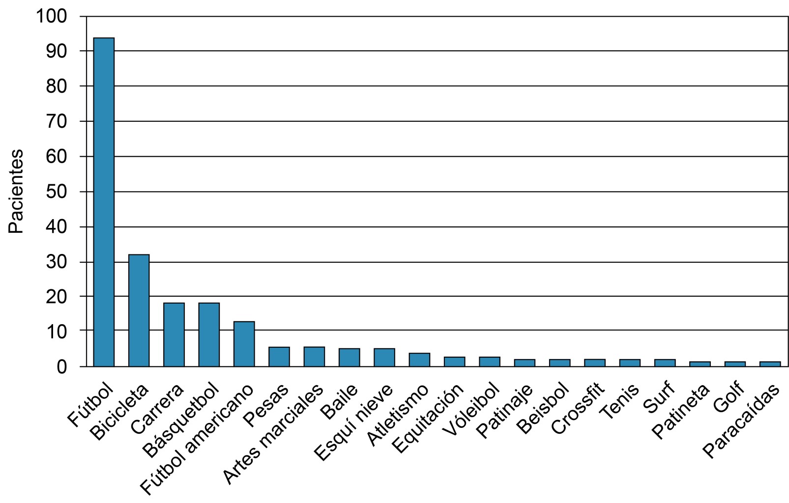 Las fracturas óseas son otras lesiones muy relevantes en los resultados: 63 de 308 (20%) diagnósticos obedecieron a este tipo de fracturas. Las fracturas óseas relacionadas por actividad física se pueden dividir por estrés repetitivo o traumatismo agudo en evento deportivo.13 En los hombres es más frecuente la clavícula y en mujeres las fracturas de mano y muñeca. La etiología deportiva en esta situación fue la bicicleta (35%), ya que presenta los mecanismos de lesión de más alta energía. El fútbol vuelve a aparecer en esta categoría como la segunda causa (25%) de fracturas y el fútbol americano en un tercer lugar (9.5%).