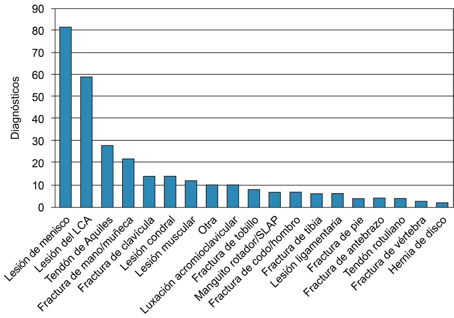 Se tomaron en cuenta 19 diferentes categorías de diagnósticos (Tabla 1), mismos que suman 308 y se desglosan por el número de pacientes atendidos y su porcentaje. Los principales diagnósticos quirúrgicos fueron (en orden de presentación): lesión de menisco reportada en 82 casos (27.1%); lesión de ligamento cruzado anterior (grado II y III) en 59 casos (19.5%) y tendón de Aquiles parcial o total en 28 casos (9.2%). En la figura 2 se puede observar el comparativo de diagnósticos de mayor a menor.