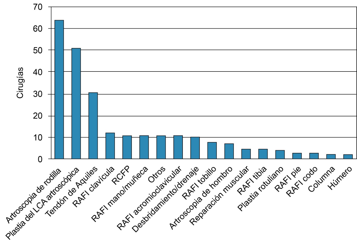 Se realizaron un total de 251 cirugías, mismas que se agruparon en 18 categorías (Tabla 1). La cirugía más frecuente fue artroscopia de rodilla con 64 intervenciones (25.5%); plastia del ligamento cruzado anterior (LCA) por vía artroscópica en 51 cirugías (20.3%), plastia del tendón de Aquiles, abierta y percutánea, en 31 cirugías (12.4%) (Figura 3).