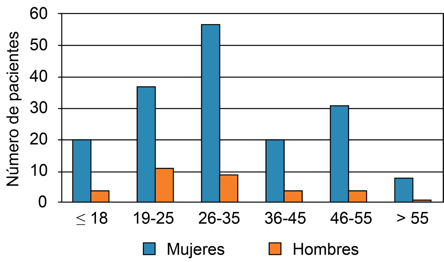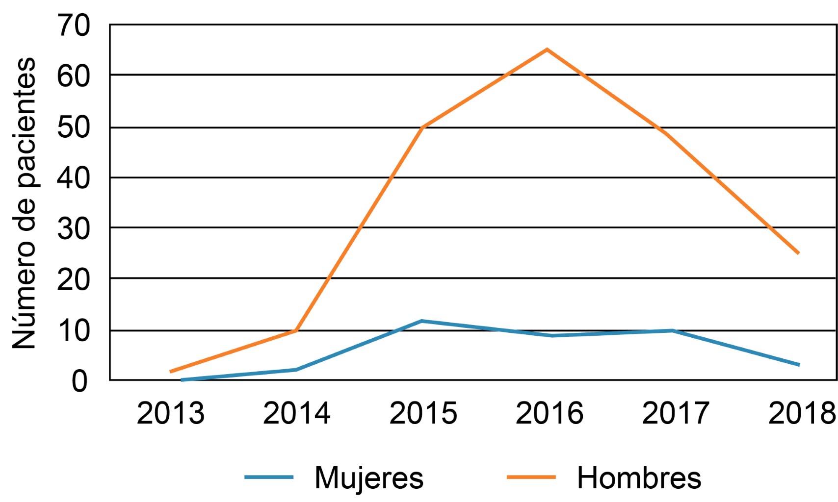 La distribución por año se comportó dependiendo el año, se puede observar en la figura 4 según el año y género. Los rangos de edad de los pacientes se reportan en la figura 5.