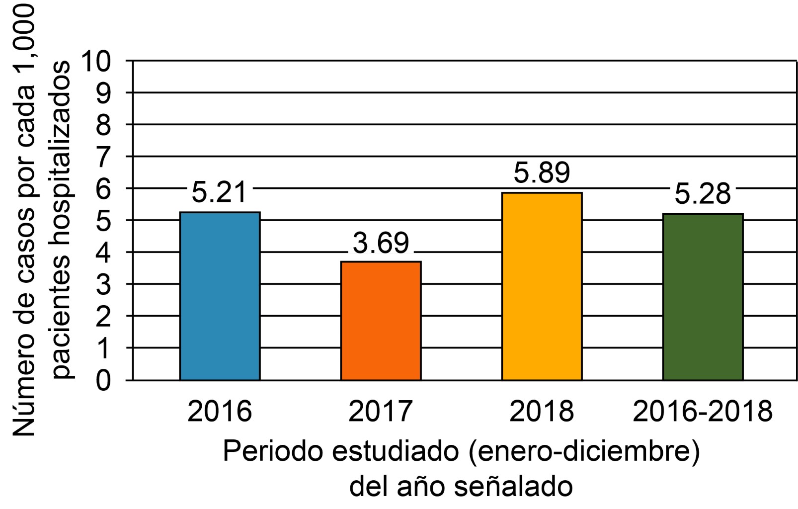 Se incluyeron un total de 188 expedientes correspondientes a pacientes que cumplieron con la definición operacional de farmacodermia (manifestación mucocutánea como efecto adverso a fármacos sistémicos) de un total de 35,592 pacientes ingresados al Hospital Ángeles Pedregal. La tasa de incidencia más elevada se presentó durante el periodo enero-diciembre del año 2016 (Figura 1) con 5.89 casos por cada 1,000 pacientes hospitalizados. La incidencia acumulada en el periodo de enero de 2016 a diciembre de 2018 fue de 5.28 casos por cada 1,000 pacientes hospitalizados.