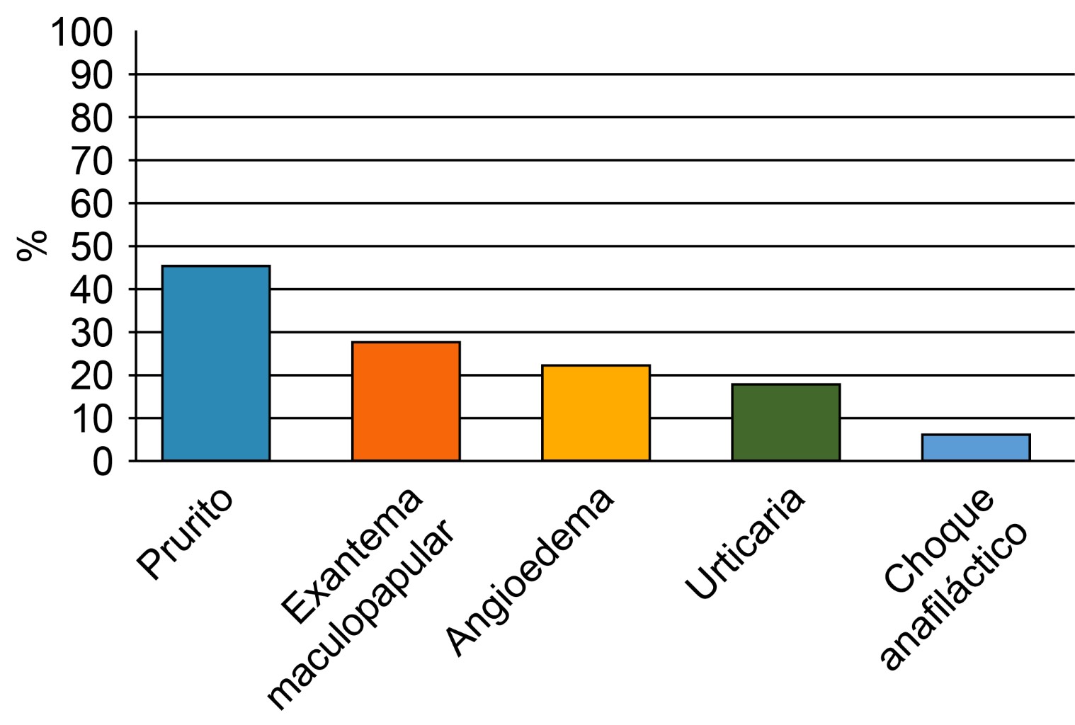 Respecto a la forma clínica de presentación, el síntoma más frecuente asociado con las reacciones adversas a fármacos fue prurito (Figura 2), los cuales requirieron manejo en unidades de cuidados críticos, como unidades de terapia intensiva o terapia intermedia. De los 188 casos, tres se clasificaron como reacciones graves (una erupción por fármacos con eosinofilia y síntomas sistémicos [DRESS], uno con síndrome de Stevens-Johnson [SSJ] y el último con necrólisis epidérmica tóxica [NET]).