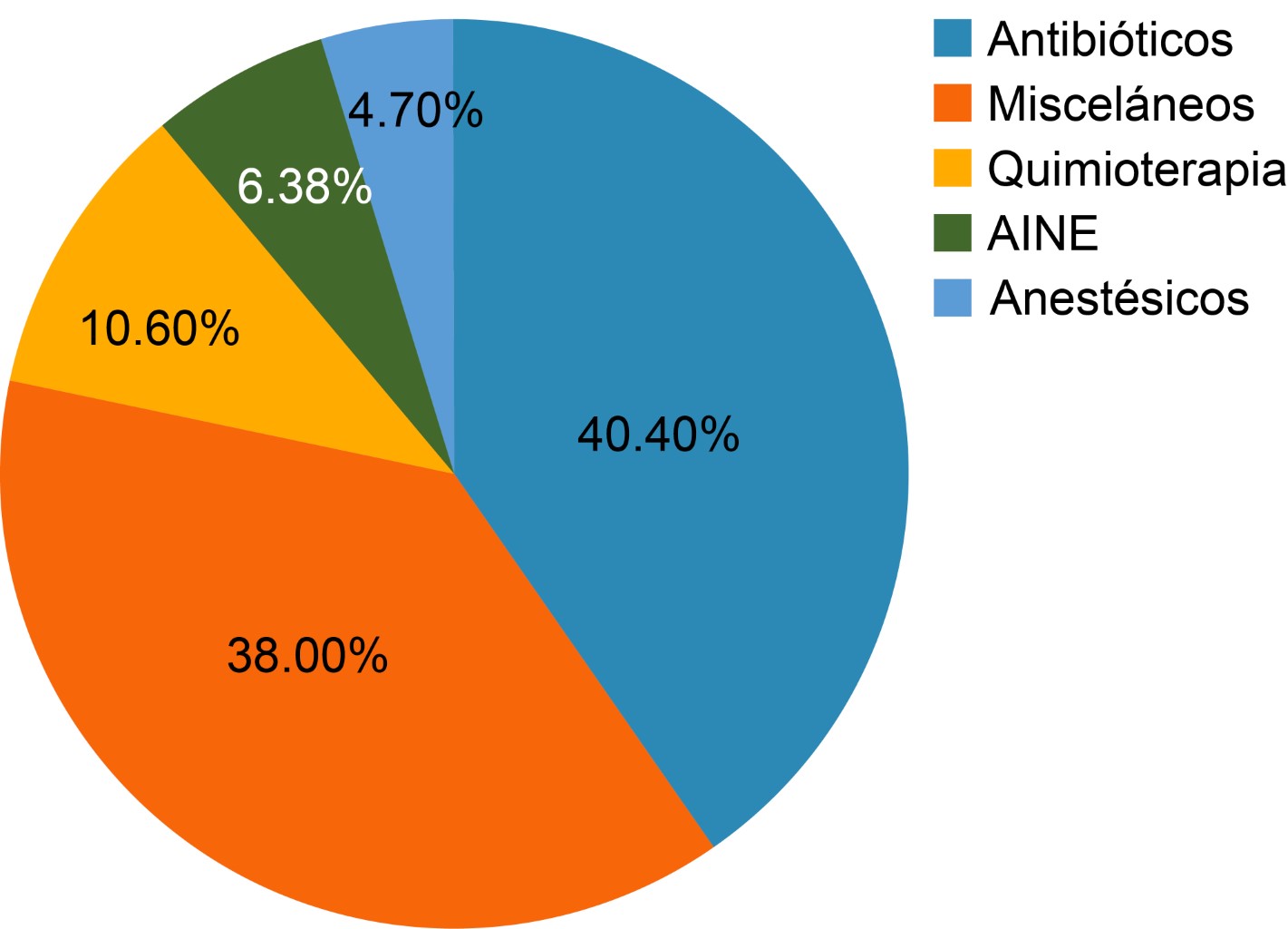 De los fármacos involucrados en los EA de nuestra población, en primer lugar están los antibióticos (40%), seguidos de medicamentos misceláneos como ranitidina, paracetamol y omeprazol (Figura 3). En lo referente a los antibióticos destaca la utilización de cefalosporinas (34%), especialmente las cefalosporinas de tercera generación como la ceftriaxona (Tabla 2), seguidas de las fluoroquinolonas (40%).