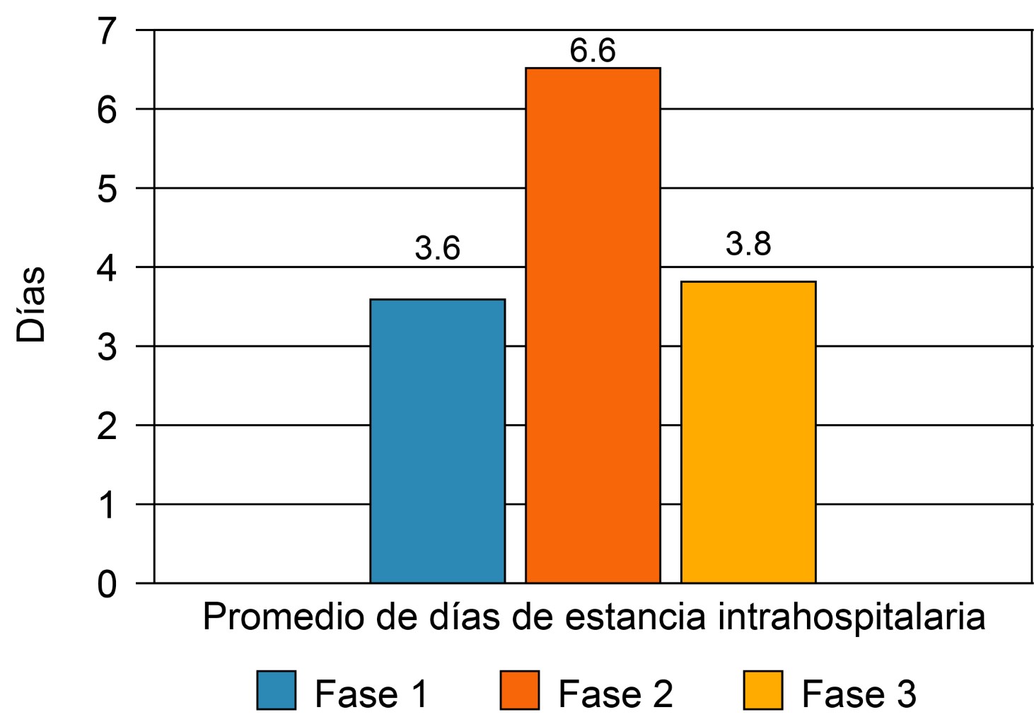El promedio del tiempo quirúrgico fue menor antes de la pandemia (1.4 horas) en comparación a durante la pandemia (1.7 horas), esto debido a que en la fase dos hubo un aumento de las cirugías de colon y recto, así como las oncológicas. Para la estancia intrahospitalaria fueron de 3.1 días antes de la pandemia en comparación con 4.6 días durante la pandemia, esto en relación con el tipo de cirugías efectuadas en cada fase.