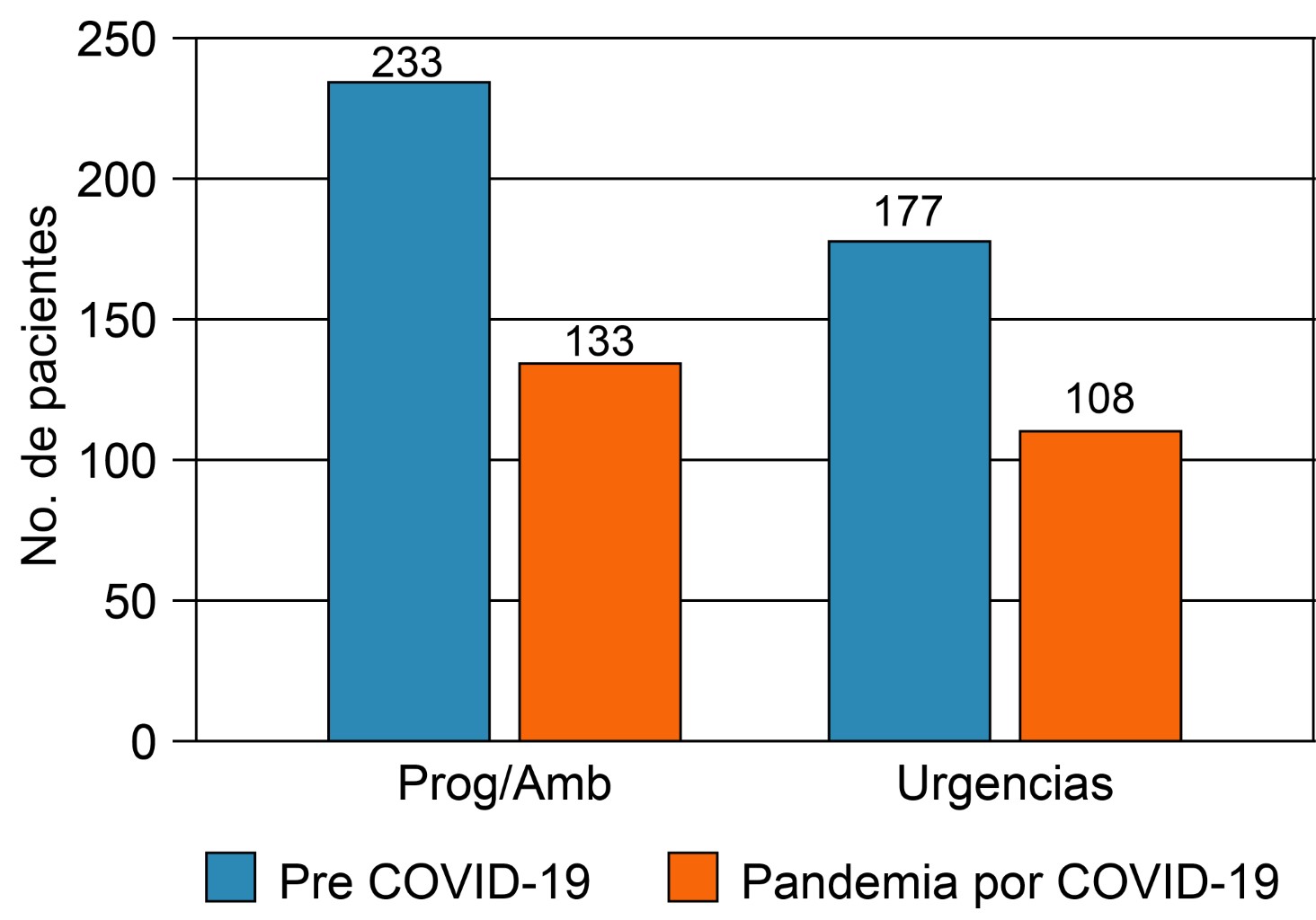 Por otra parte, se realizó un análisis comparativo de los datos obtenidos de los tres meses previos al inicio de la pandemia, del 01 de diciembre de 2019 al 27 de febrero de 2020 con el hospital operando de manera normal. Se observó predominio por el sexo femenino. Durante la fase previa a la pandemia por COVID-19, 56.8% de los pacientes ingresó para cirugía programada y 43.1% ingresó por el Servicio de Urgencias, mientras que durante la pandemia los resultados fueron de 55.1 y 44.8%, respectivamente (Figura 4). Con estos datos podemos observar una disminución de 42.9% en las cirugías programadas, 38.9% en las cirugías de urgencia y 41.2% en la productividad general del servicio.