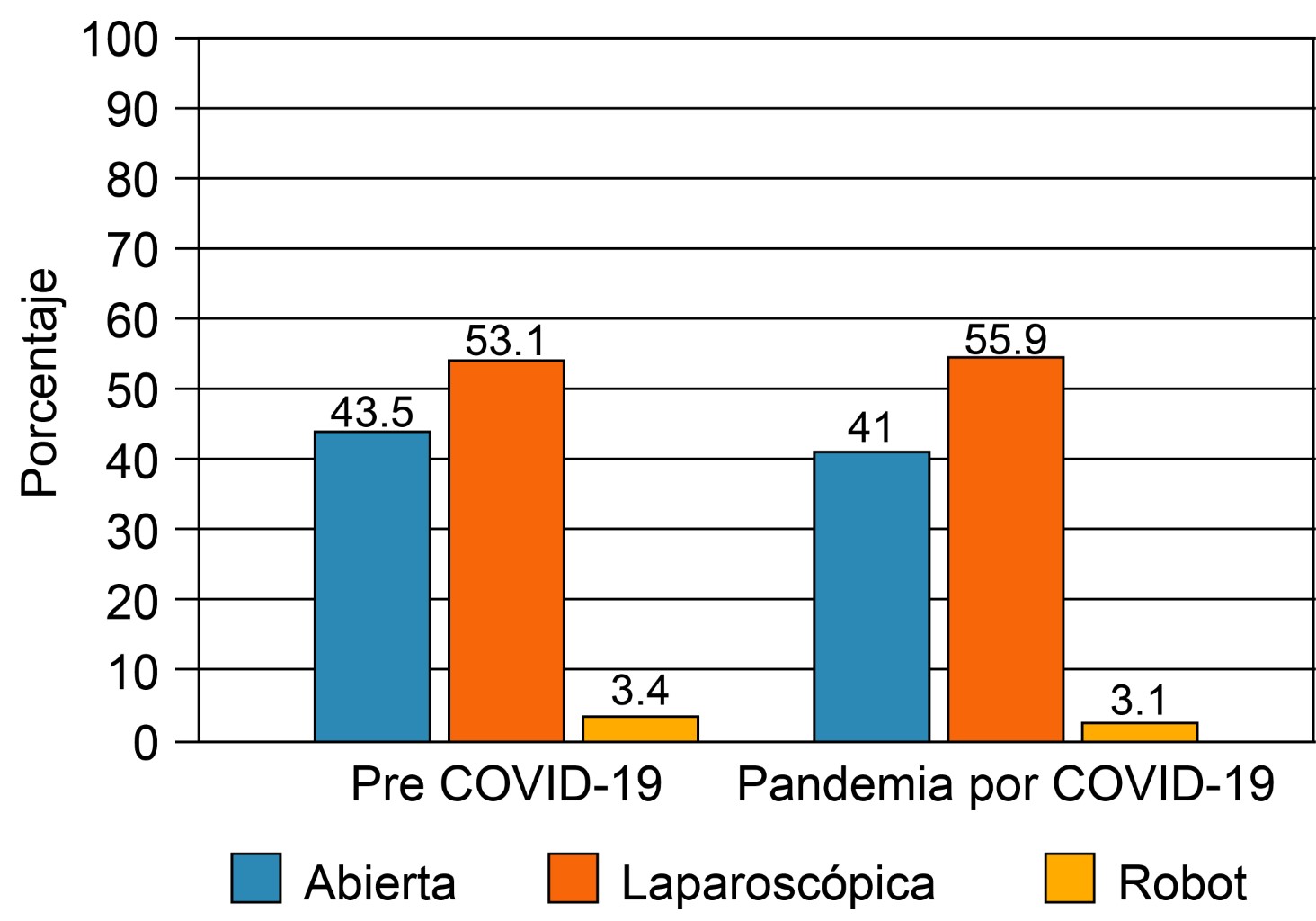 En cuanto al tipo de cirugía, predominó la técnica laparoscópica, 55.9% en pandemia versus 53.1% en fase preCOVID-19; seguido por la técnica abierta predominante en la fase preCOVID-19 43.5 vs 41% en pandemia y finalmente asistida por robot en 3.4 vs 3.1%, respectivamente (Figura 5).