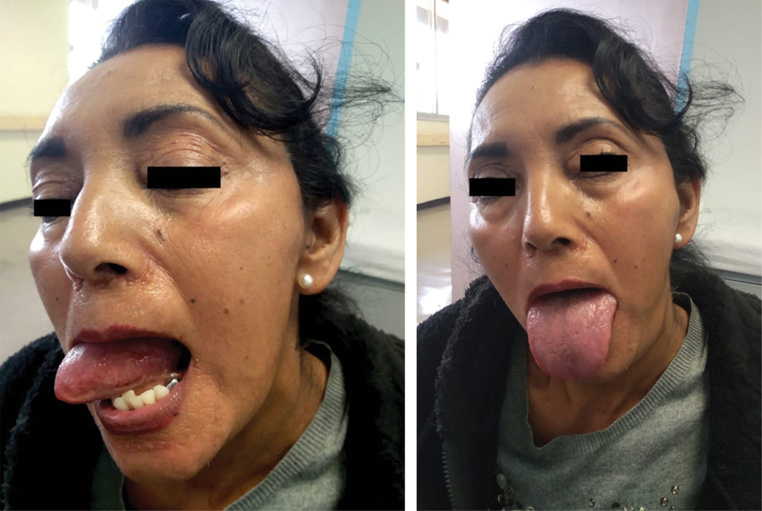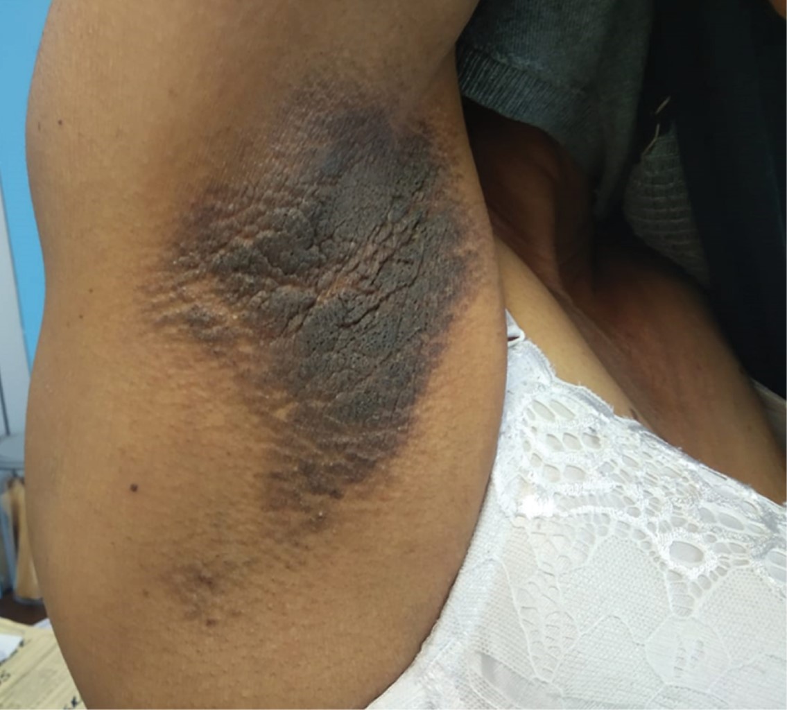 Inició con dos dermatosis: la primera, localizada en la cabeza, que afectó párpados, región perinasal y mentón, caracterizada por múltiples pápulas céreas lisas, además de afección lingual con macroglosia y festoneado en los bordes laterales (Figura 1); una segunda, localizada en la extremidad superior, que afecta la región axilar, caracterizada por la presencia de una placa color marrón oscuro de superficie anfractuosa acompañada de sensación urente (Figura 2). Recibió manejo quimioterapéutico con ciclofosfamida + bortezomib + dexametasona por seis ciclos, hasta diciembre de 2018, posteriormente, en mayo de 2019, se dio consolidación con trasplante de células progenitoras hematopoyéticas autólogo. Al momento, la paciente se halla en remisión completa.